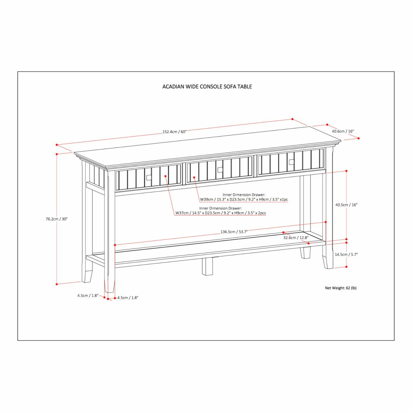 - Dimensions: 60W x 16D x 30H in.