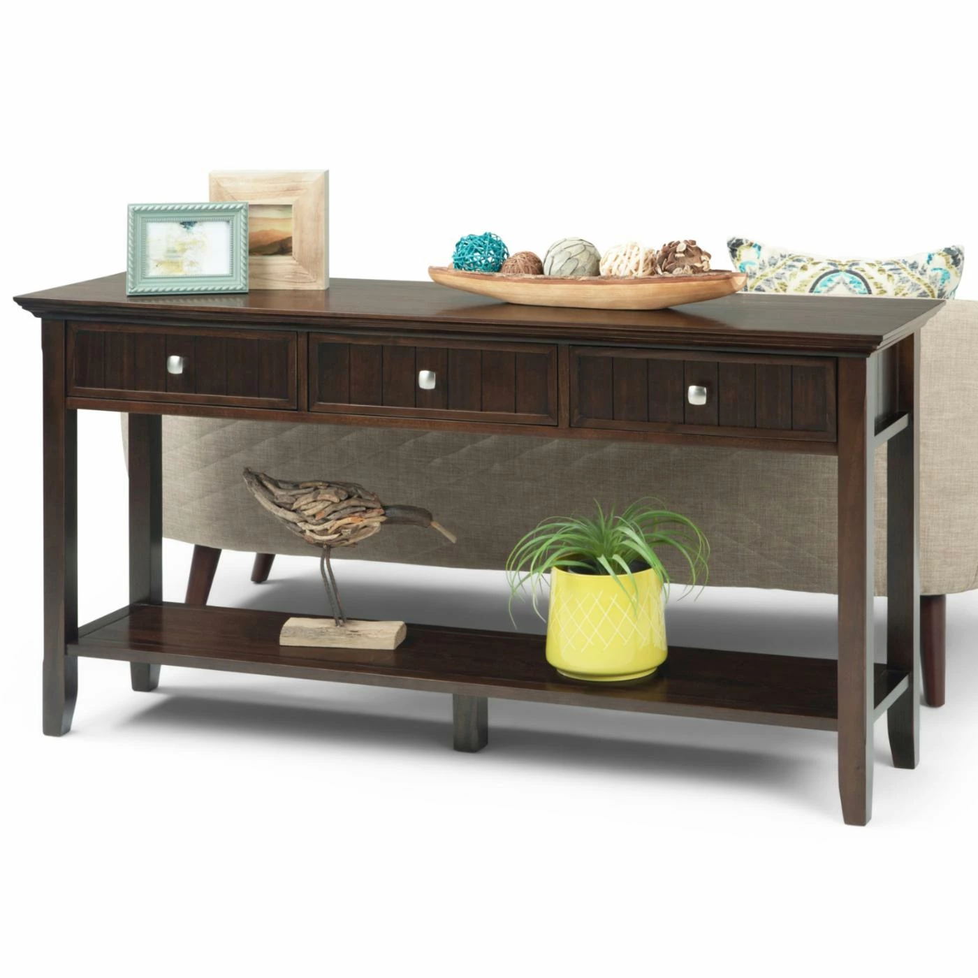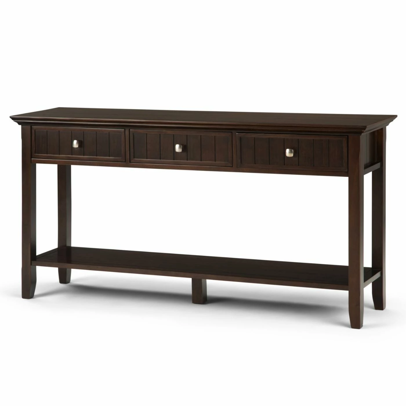 Add a place for storage and display with the Brooklyn + Max Brunswick 3 Drawer Pine Wood Console Table. This console table has three drawers for ample storage. The molded crown edging gives this piece a traditional touch to look great in any room.