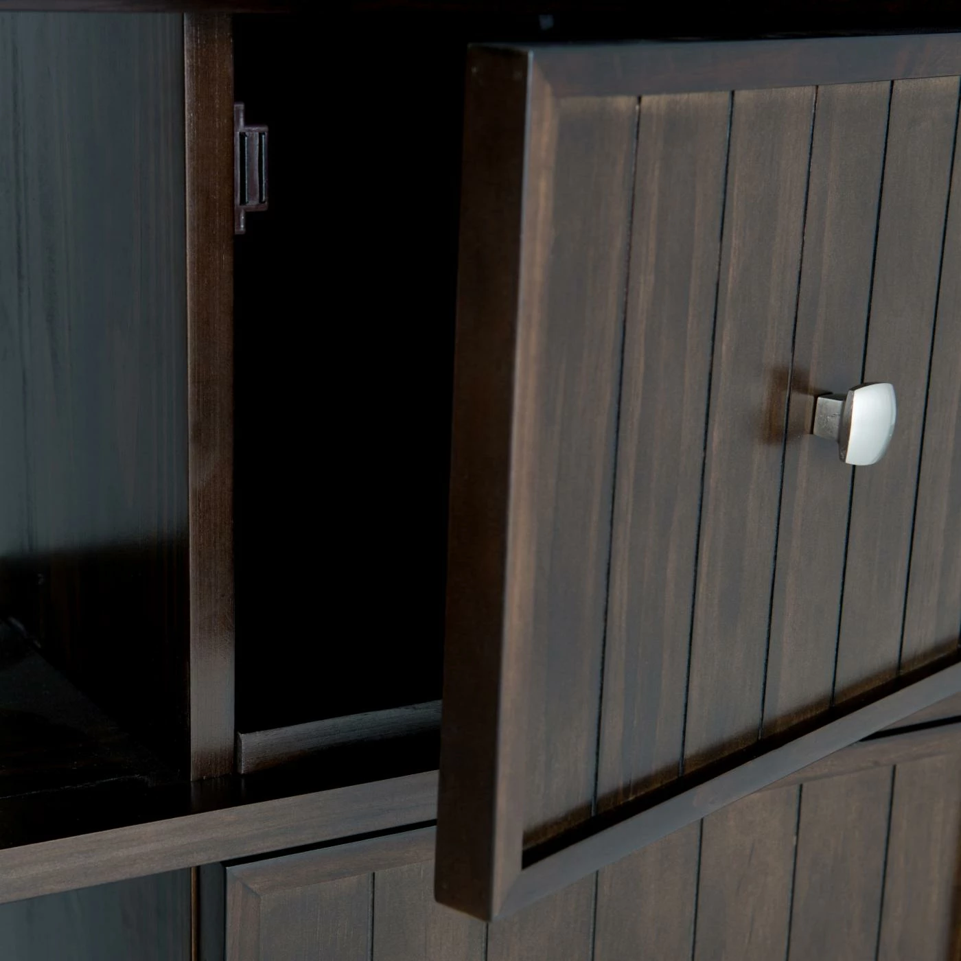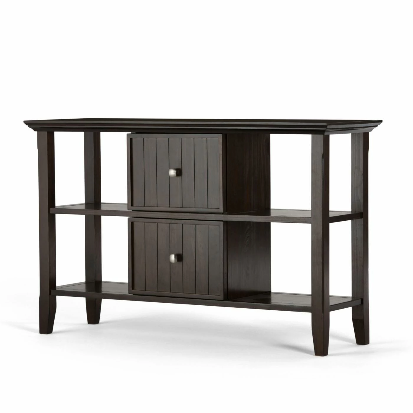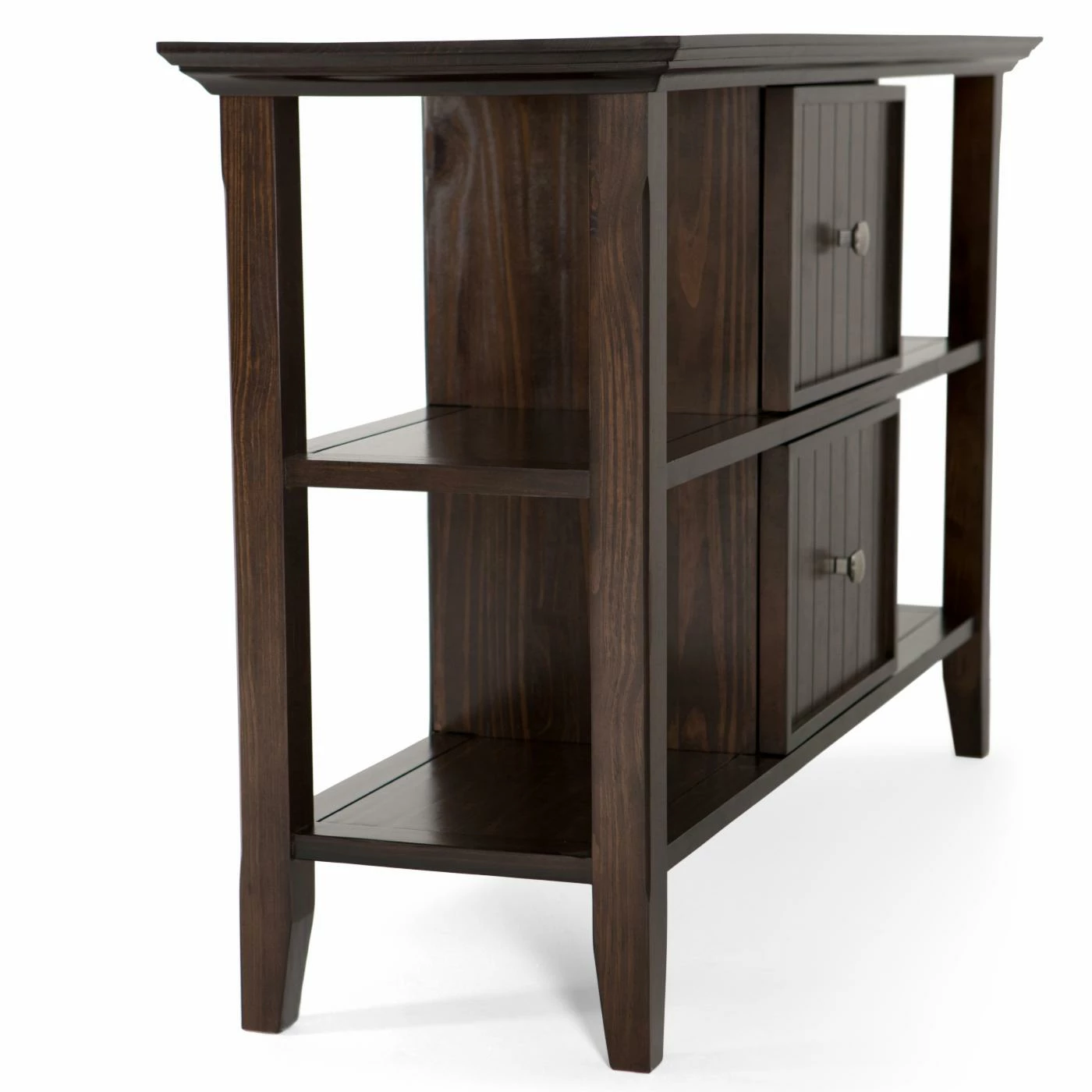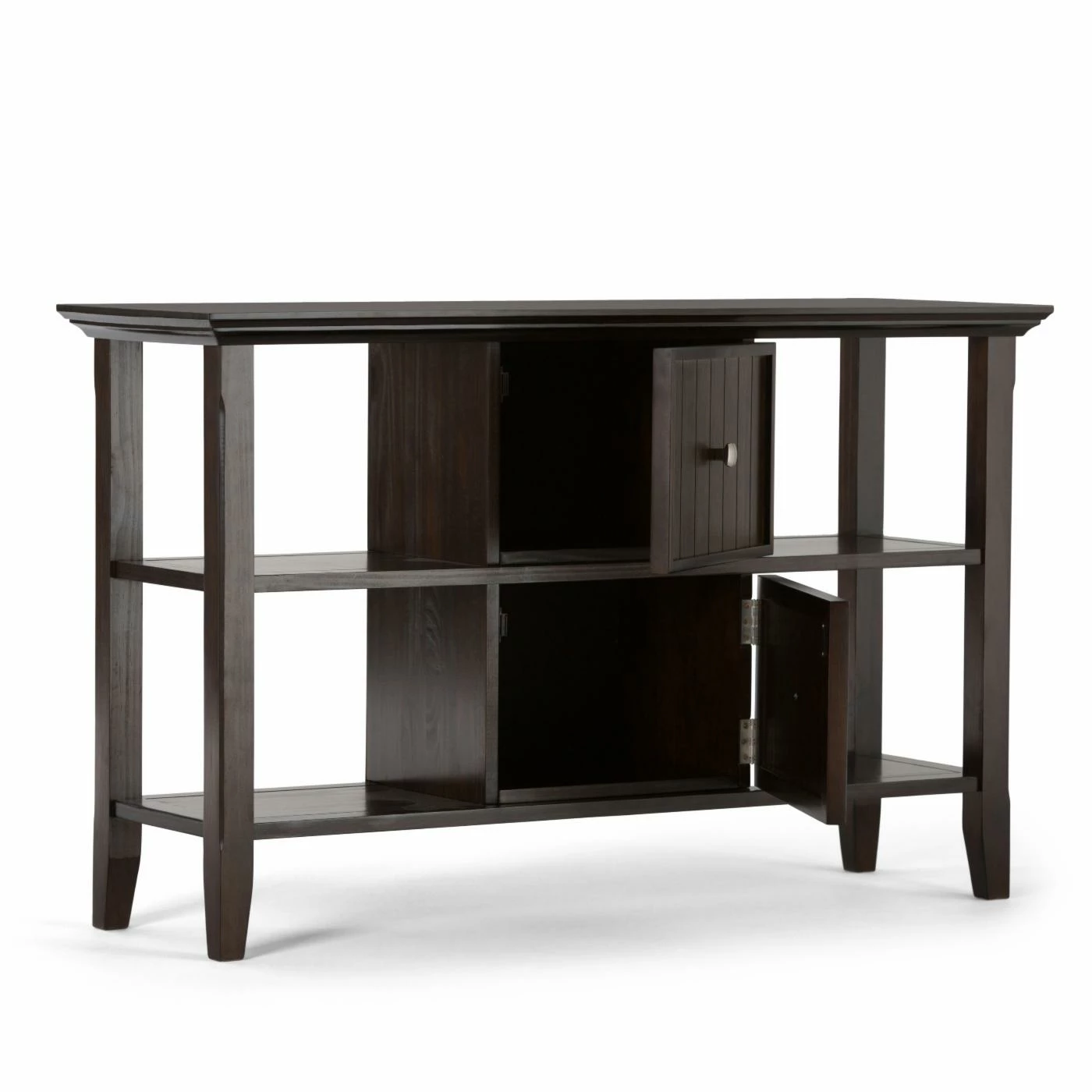 Add a unique touch to any room with the Brooklyn + Max Brunswick 2 Door Solid Wood Sofa Table. This sofa table has a rich brown finish with plenty of storage options. The two center compartments are concealed behind two doors. On either side, there are two more storage shelves that can also be used for display.