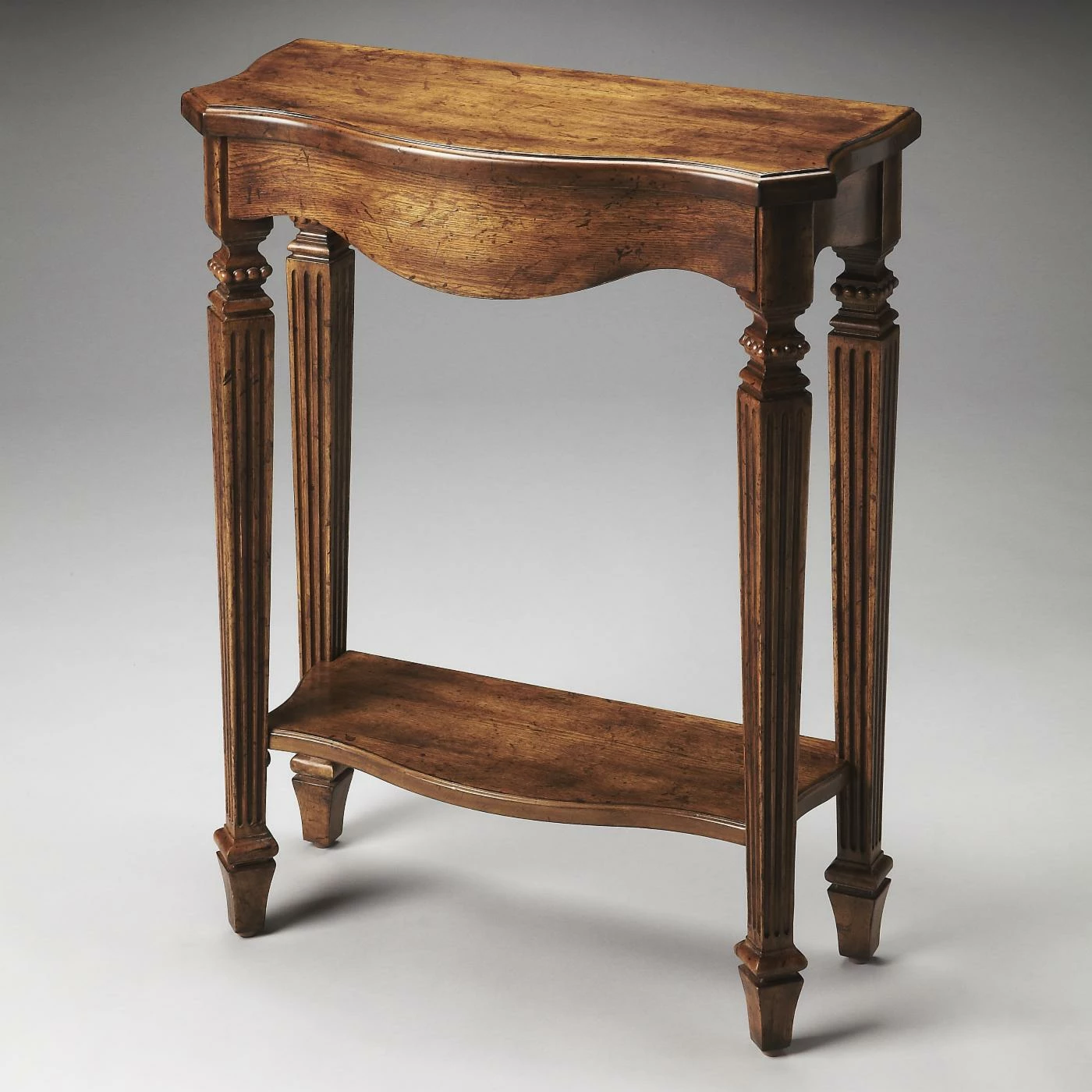 A console table that’s worthy of a smile, the Butler Cheshire Console Table – Dark Toffee is graced with curves. This wooden table features a Dark Toffee finish that accentuates its curvy apron and ribbed column legs that end in ballerina feet. The top and lower shelf are made for display.