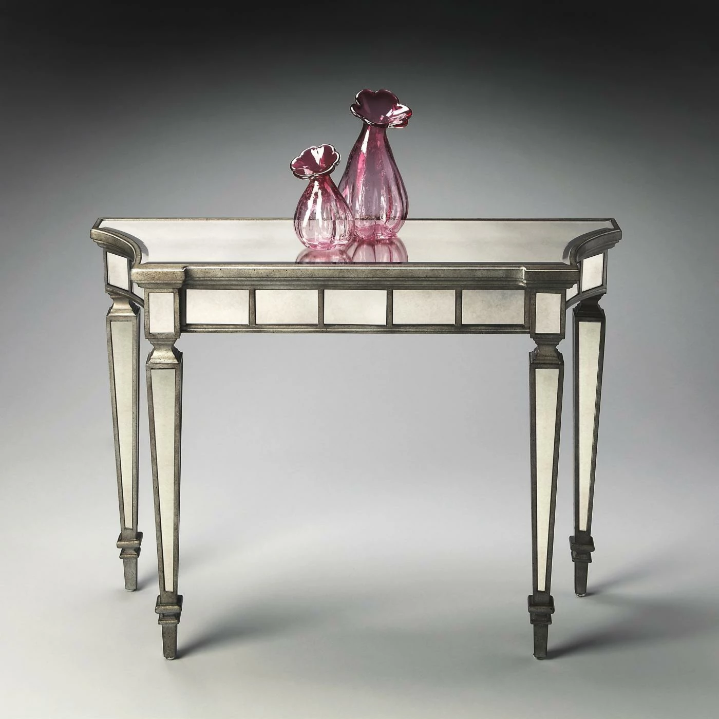 Hollywood glam, the Butler Console Table – Mirror – 40W in. would make a dramatic make up table in the boudoir or a striking accent piece in the foyer. This console table features a curvy top, is well-crafted of solid wood accented by antiqued mirror inlays, and stands on slender, tapered legs.