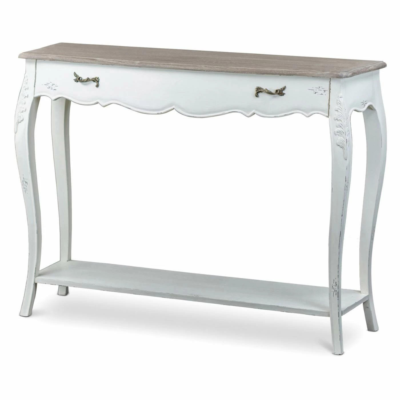 A serpentine apron, carved cabriole legs, and antique metal pulls give the Baxton Studio Bourbonnais Console Table an elegant, traditional look. The console table is fabricated out of engineered wood and then covered with mindi wood veneers for an authentic solid hardwood appearance. For a touch of timeworn appeal, the console table has a two-tone finish with a weathered natural wood top and a whitewashed base. As functional as it is fashionable, the console boasts a full-width drawer and a lower display shelf.