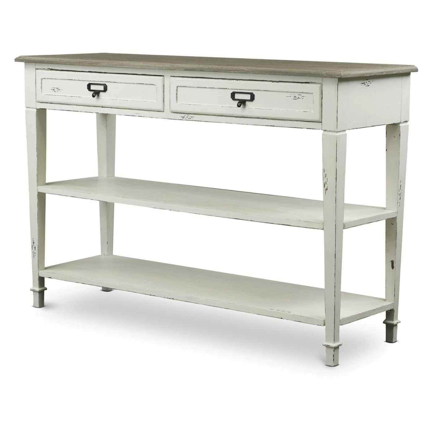 A heavily distressed whitewashed and natural wood finish gives the Baxton Studio Dauphine Console Table a rustic, elegant vibe that is perfect for traditional, shabby chic, and country French living spaces. The table is fabricated out of sturdy engineered wood, and the top is covered with mindi wood veneers for a natural woodgrain look. You can store small items away within the two drawers, which are equipped with antiqued metal pulls to enhance the rustic appeal of the piece. Two lower shelves provide space for showing off decorative accents.