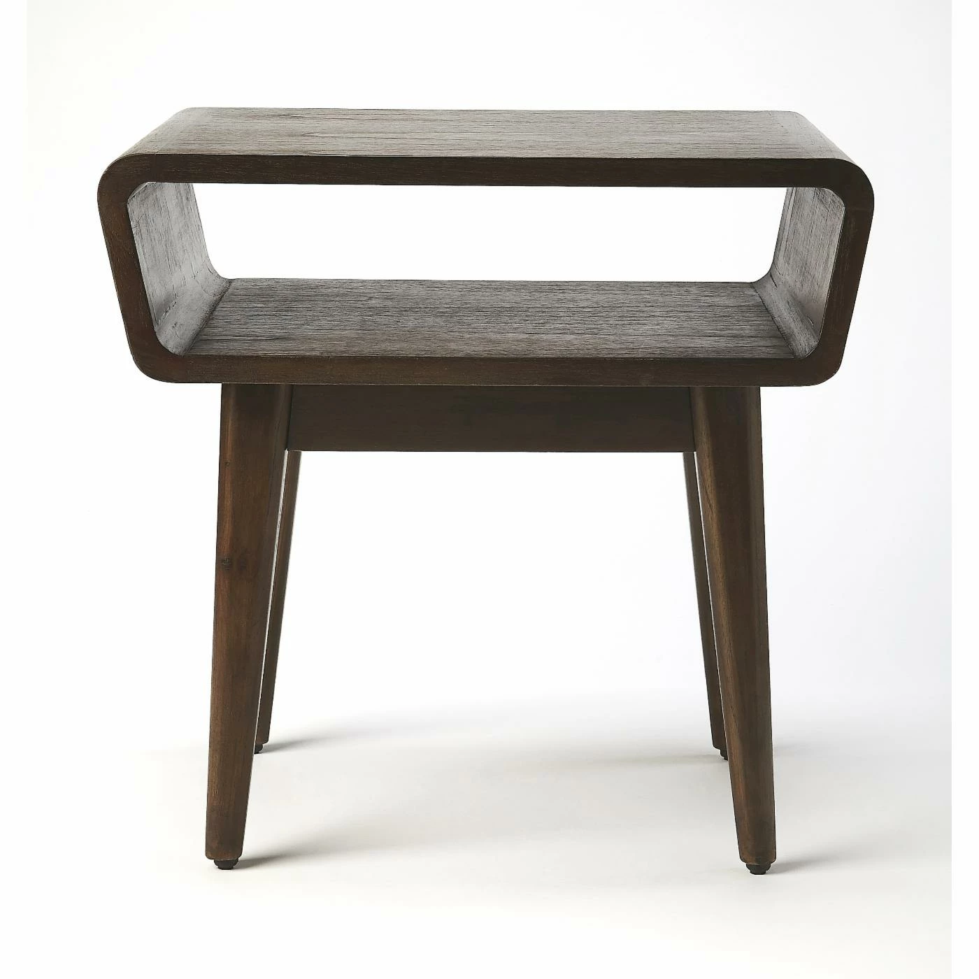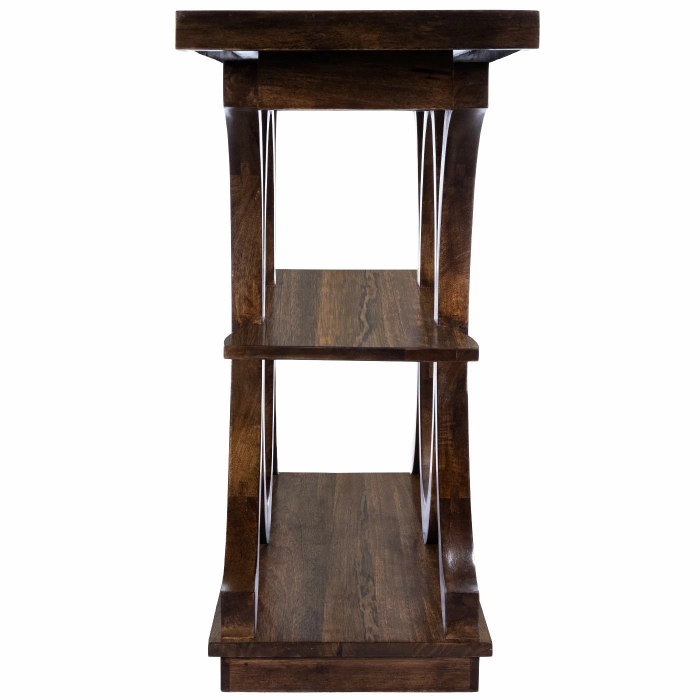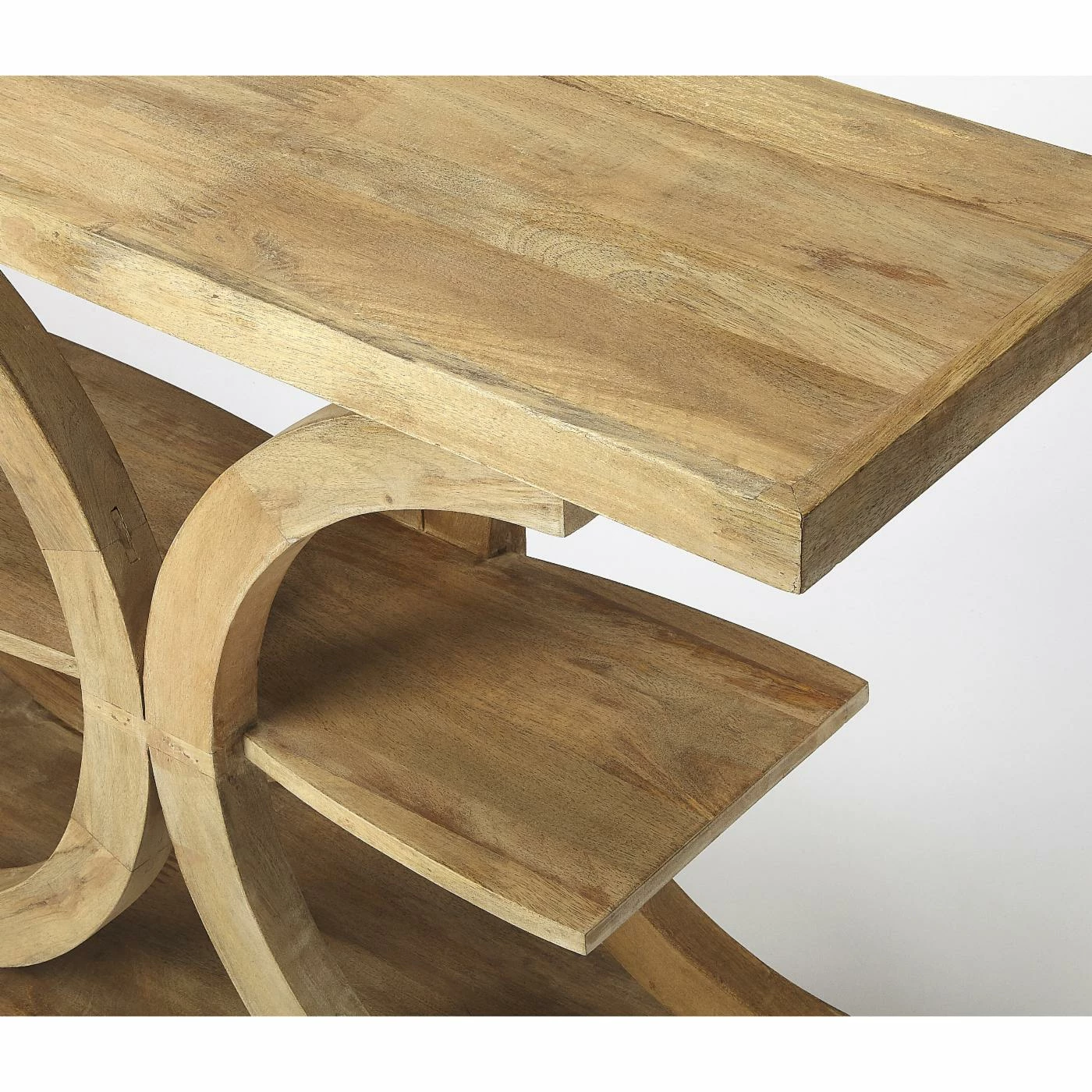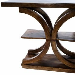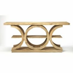 Make a statement with the Butler Specialty Stowe Rustic Console Table. Constructed of solid mango wood, this console table has a unique, sculptural design that is sure to stand out. This three-tier table has a shelf in the center to store and display your favorite books or magazines.
