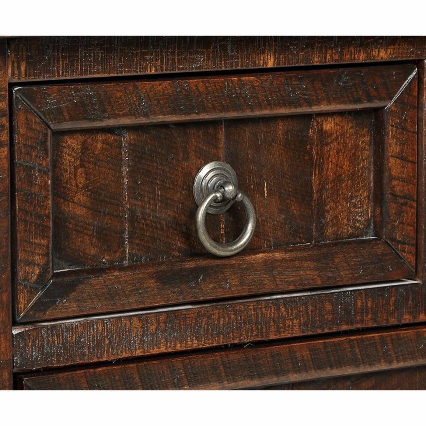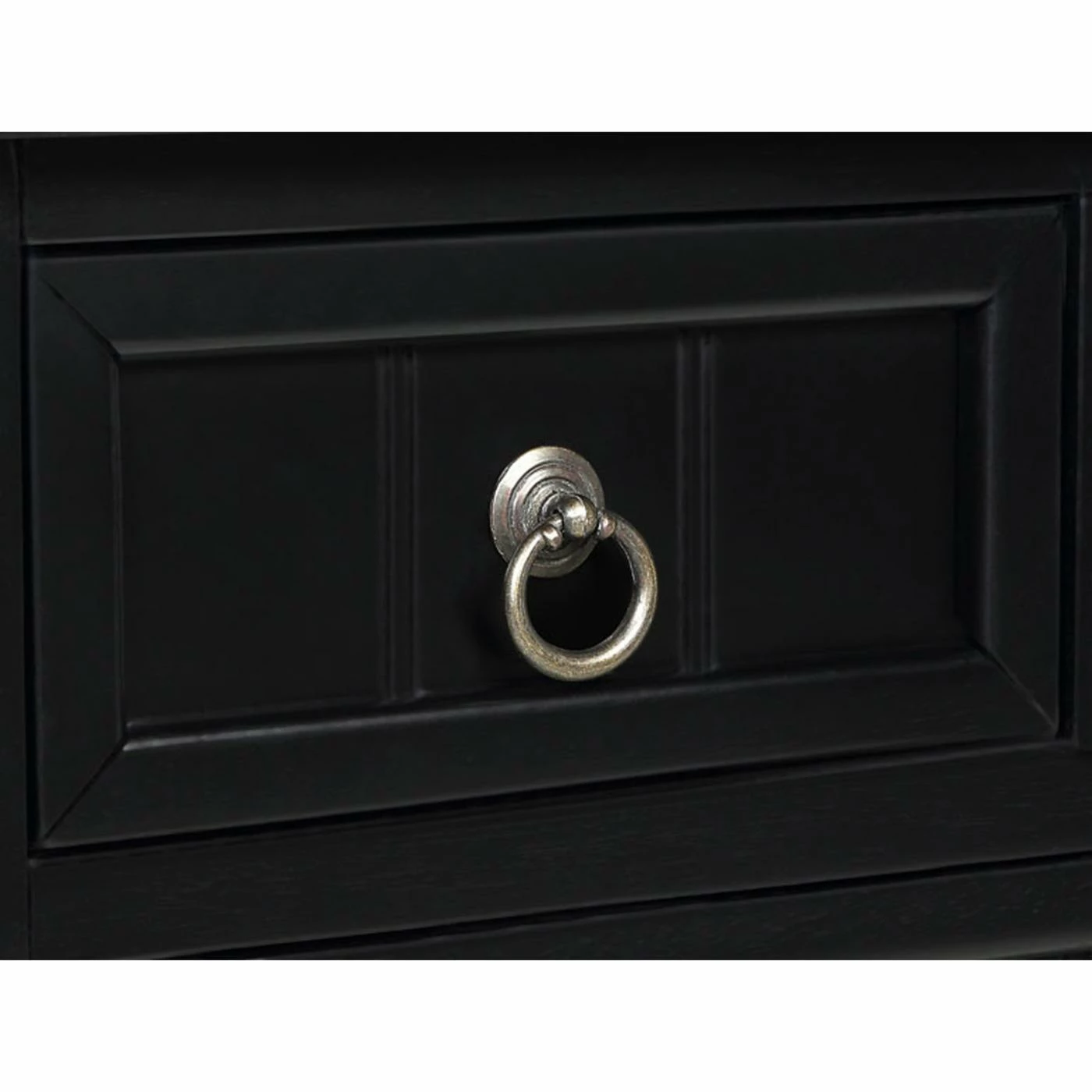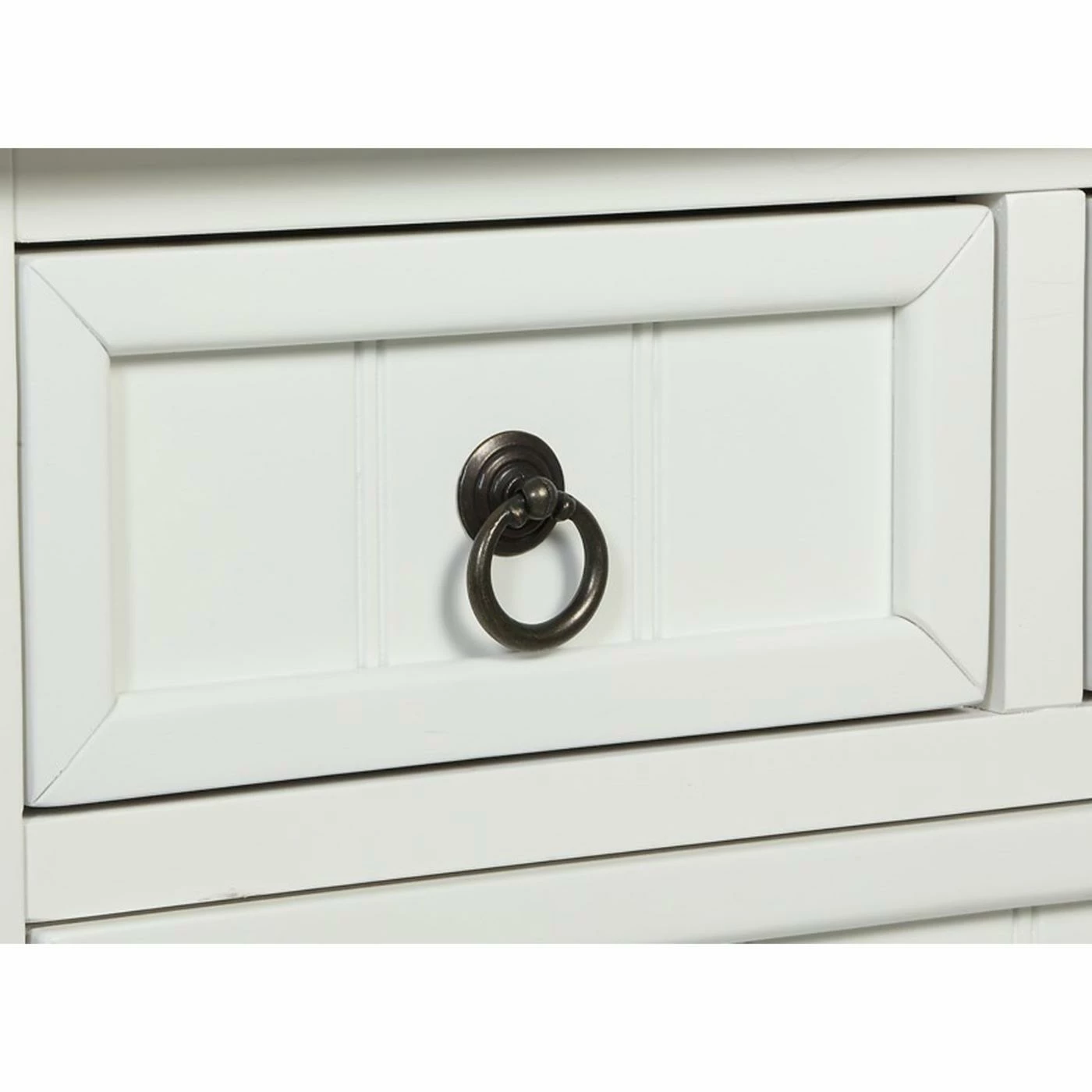 - Shaker style drawer fronts, metal ring pulls