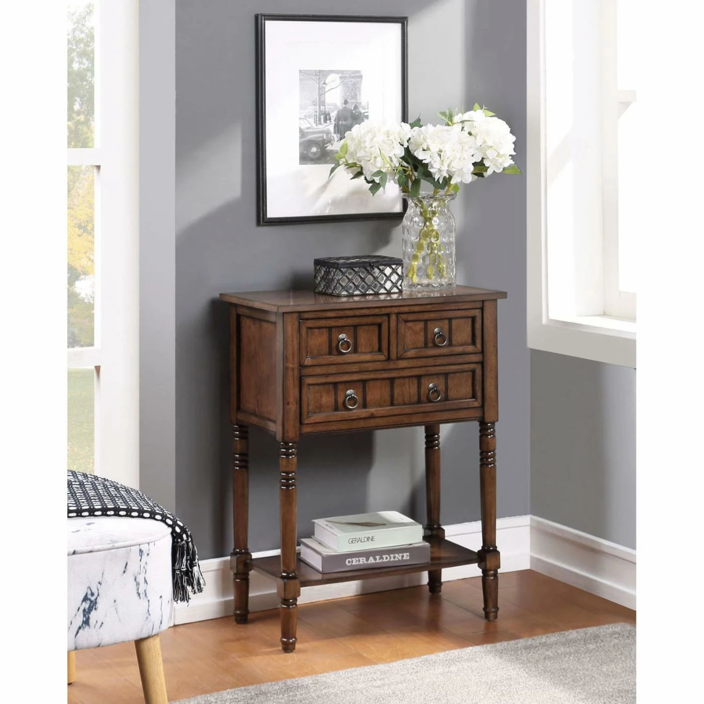 Add storage and style to your space with the Convenience Concepts Kendra Hall Table. This charming hall table features Shaker inspired drawer fronts with metal ring pulls. The three drawers provide plenty of storage space for the odds and ends that might clutter up your home. An open bottom shelf is the perfect spot for stray books or magazines. Choose from available finishes to find the Convenience Concepts Kendra Hall Table that works best for your home.