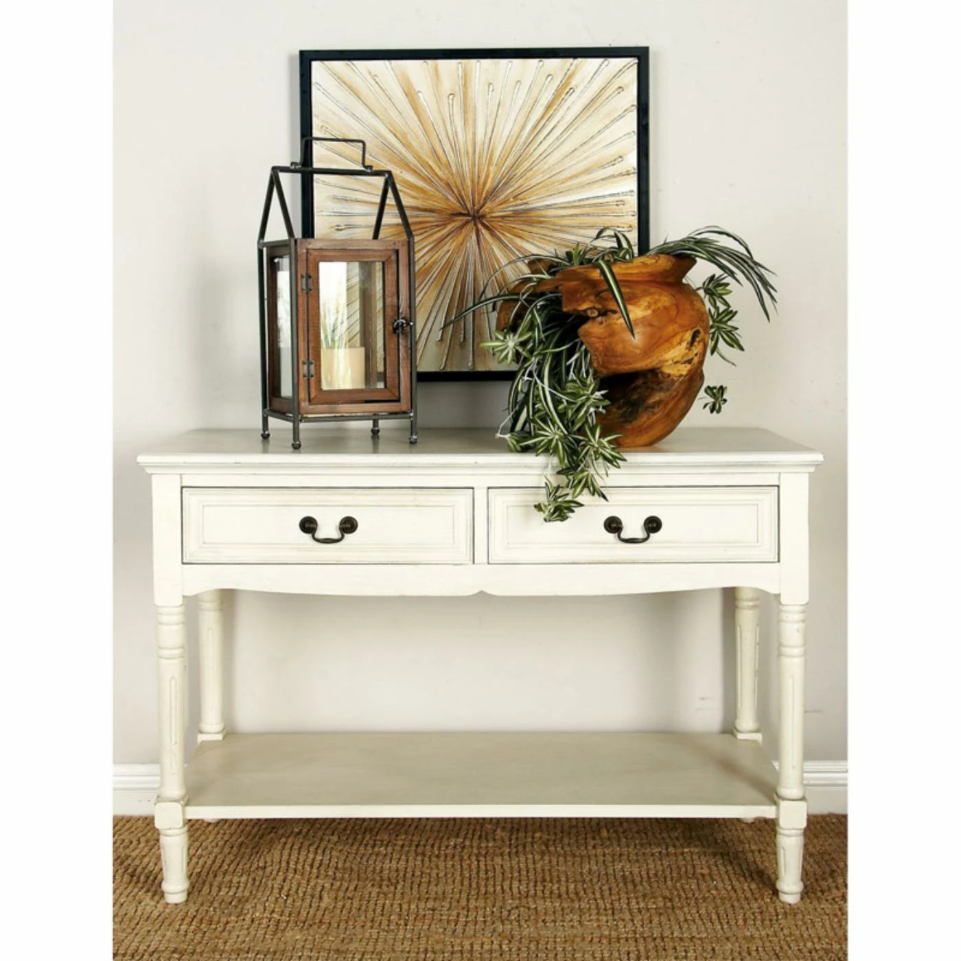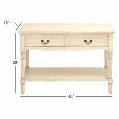 Brighten up your traditional entry way or living room with the timeless beauty of the DecMode 2 Drawer Console Table – Antique Ivory. This narrow table boasts two drawers with brass pulls and a lower shelf for additional display of your favorite items.