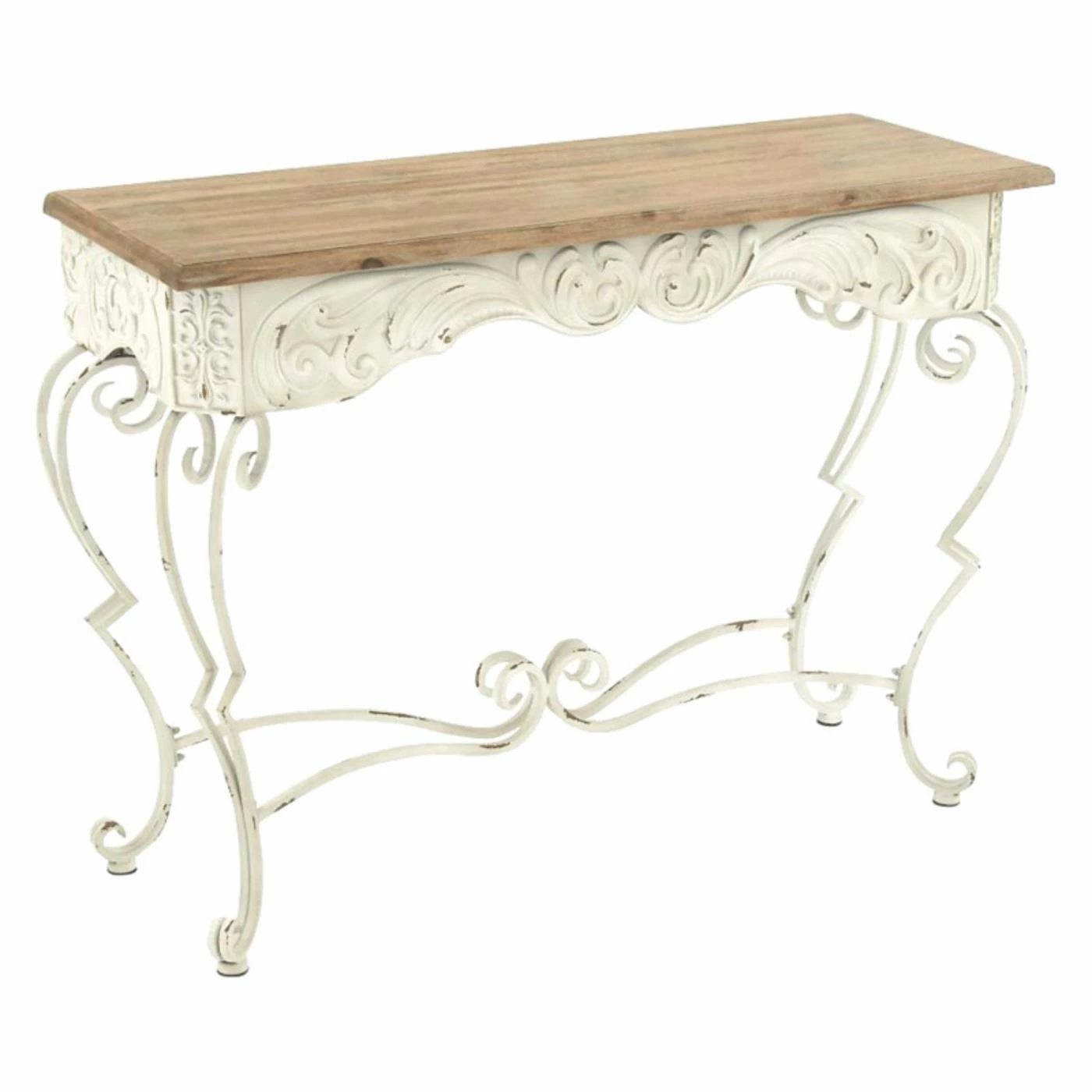 Intricate scrollwork enhances the traditional elegance of the DecMode 42 in. Metal Console Table. This beautiful console table showcases the natural beauty of the fir tabletop.