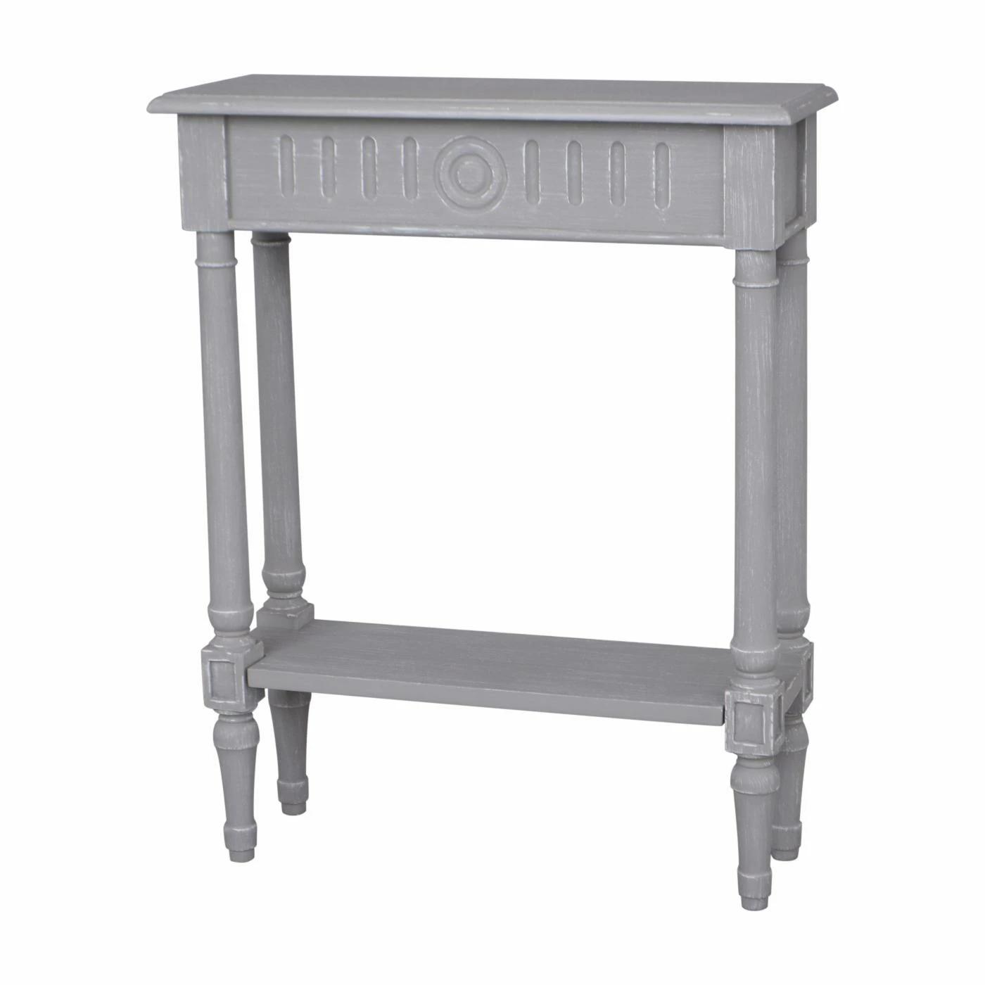 The slim design of the East At Main Ava Console Table is ideal for apartments or small spaces like an entryway or bathroom vanity area. This table is handcrafted of bayur wood with a gray painted finish that’s distressed on the elegant carvings and turned legs of the piece. A lower shelf allows for additional display space.