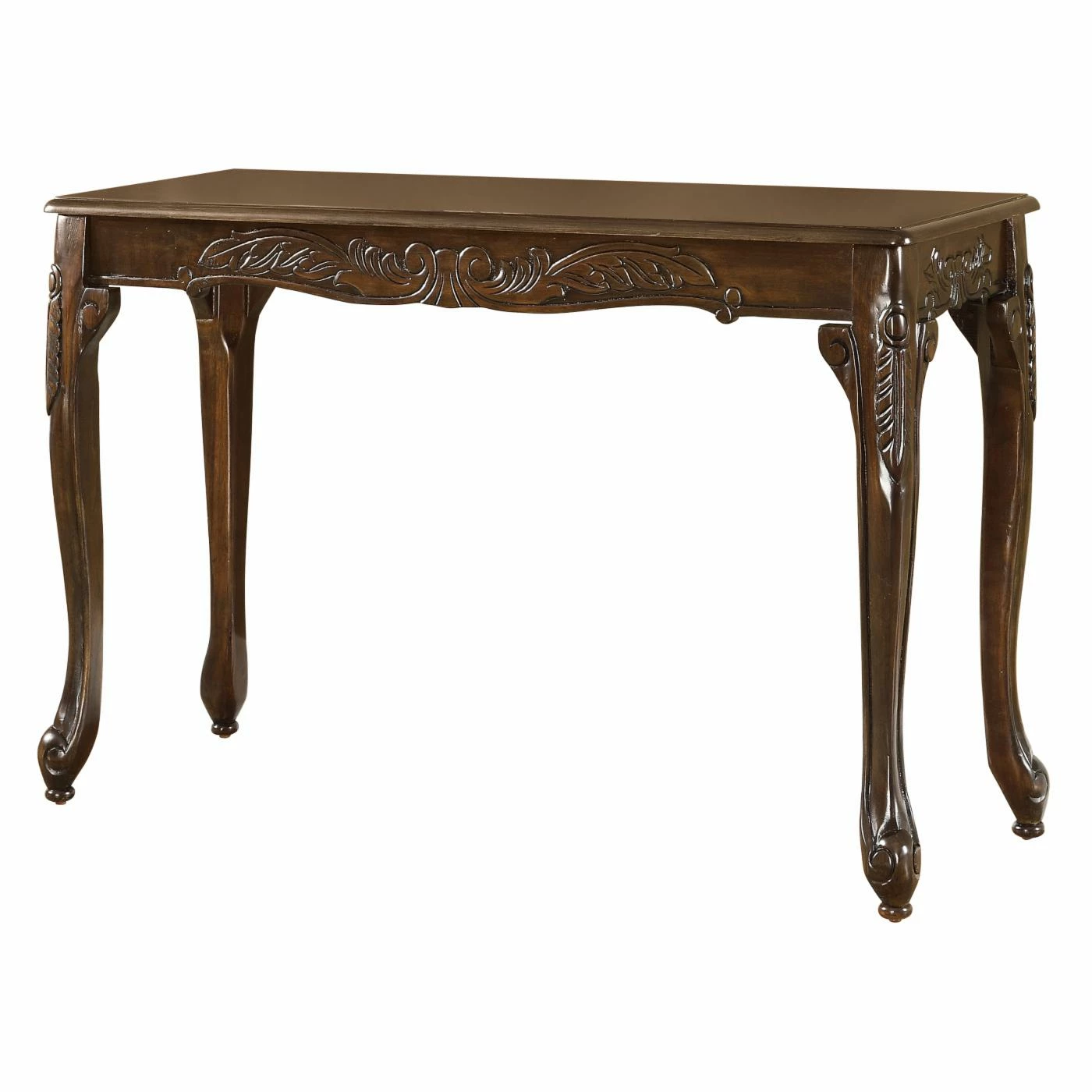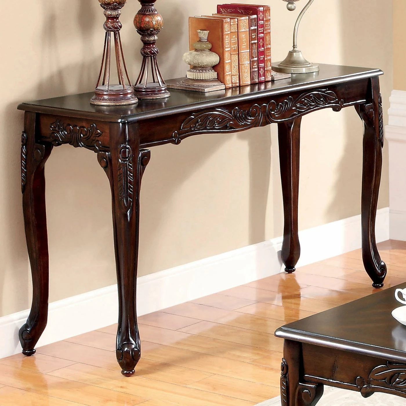 The traditional Furniture of America Yandel Traditional Sofa Table is a modern take on a classic design. A spacious rectangular table top provides ample storage and display space for your special items and is embellished with romantic, ornate carvings. Smooth carved details accentuate the beautiful wood finish. Supported upon cabriole legs with a claw foot finish, the Traditional Cherry 48-inch Solid Wood Sofa Table in Dark Cherry is crafted of a sturdy wooden construction.