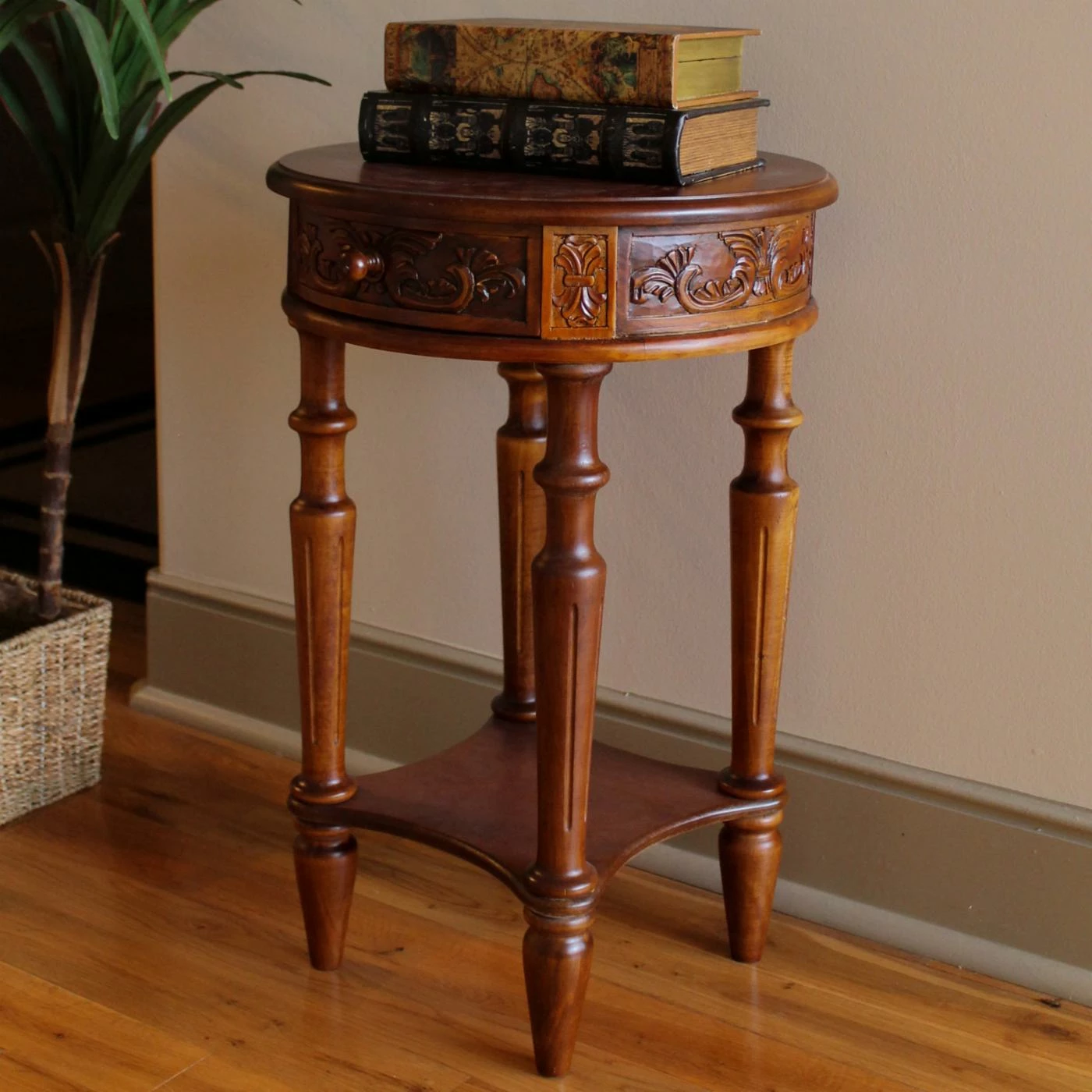 Add elegance and sophistication to even the smallest of spaces with the International Caravan Windsor Hand Carved Walnut Stain Wood Hall Table. Inspired by the ornate furniture of the 18th and 19th centuries, this hall table features hand-carved detailing along the sides and classic spindle legs. Its hardwood construction is highlighted by the rich walnut finish. Its drawer gives you a convenient place to store reading glasses, stamps, and other small items, while the top is large enough for pictures or can be left empty for a more simple look.