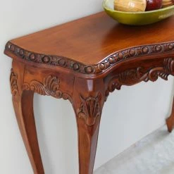 The International Caravan Windsor Hand Carved Walnut Stain Wood Sofa Table shows off your love of fine craftsmanship and attention to detail. Inspired by the furniture of the 18th and 19th centuries, this console table features ornate and intricate hand-carved detailing along the sides and edges and gracefully turned out legs. Crafted from durable hardwood and finished in a rich walnut which highlights the wood grain, this table adds warmth and beauty to any room. Its top is large enough to hold your favorite curios or pictures, making this table functional as well as elegant.