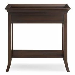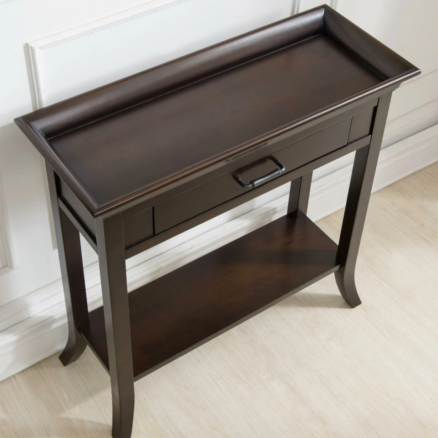 From a hallway to a foyer, the Leick Home Tray Edge Hall Stand and its compact footprint makes the most of your space. Its flared tray edges pair with the splayed saber legs to create a stylish silhouette, while the chocolate cherry finish graces the solid hardwood and birch veneers. The drawer, handy for everyday essentials, features an antiqued bronze pull and solid wood drawer box. A lower shelf is sized just right for a favorite home accent or two.