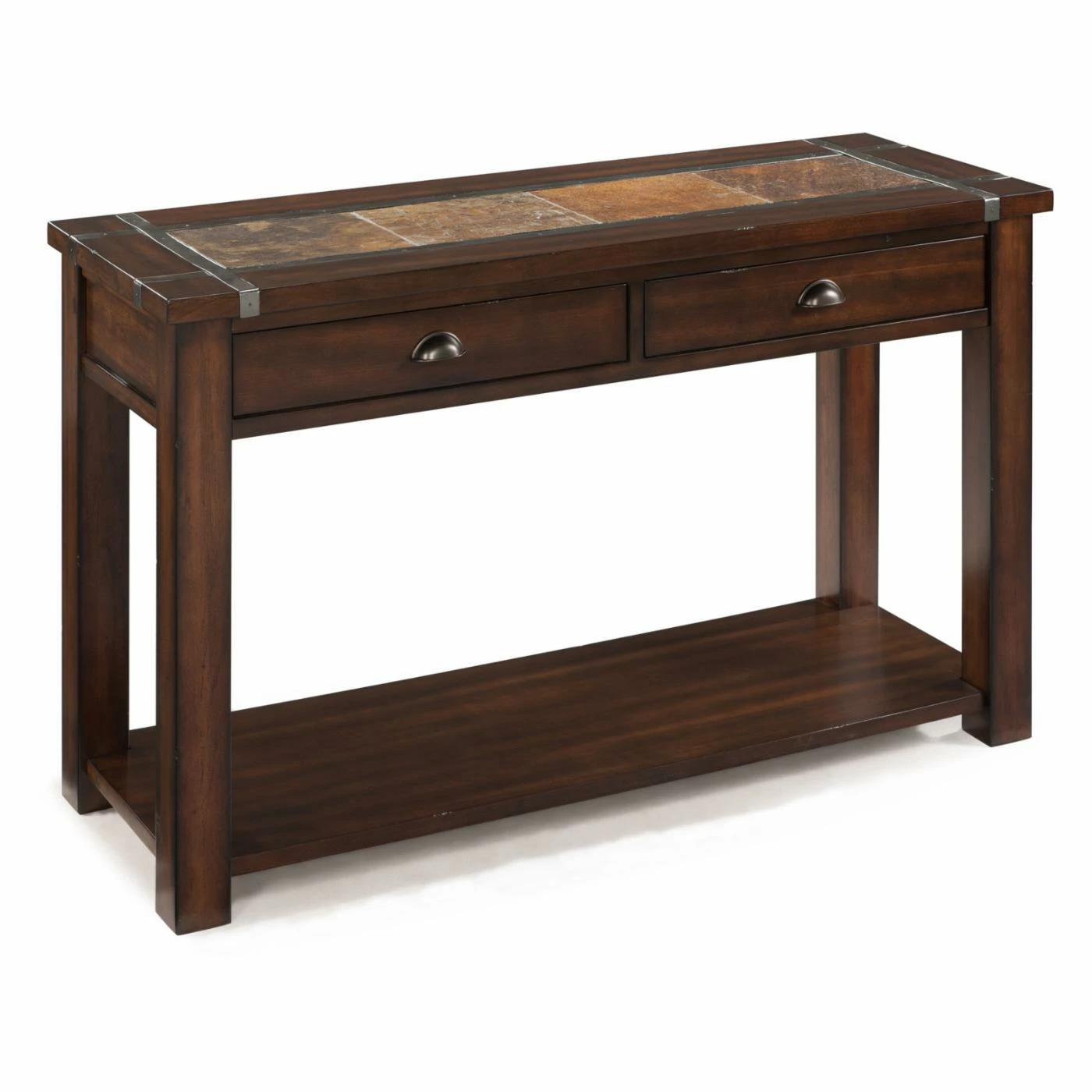 A rustic slate design pattern is the perfect complement to a timeless cherry wood finish in this Magnussen Rectangle Console Table. The traditionally styled console table is sturdy, constructed of engineered wood and cherry veneer. But it’s also functional, too. The 30-inch-tall console table features two drawers for storage, and its spacious tabletop provides room for a variety of design ideas, from picture frames to greenery to antique china. Or, shun the more traditional uses and turn the wide table into a buffet during gatherings with friends and family.