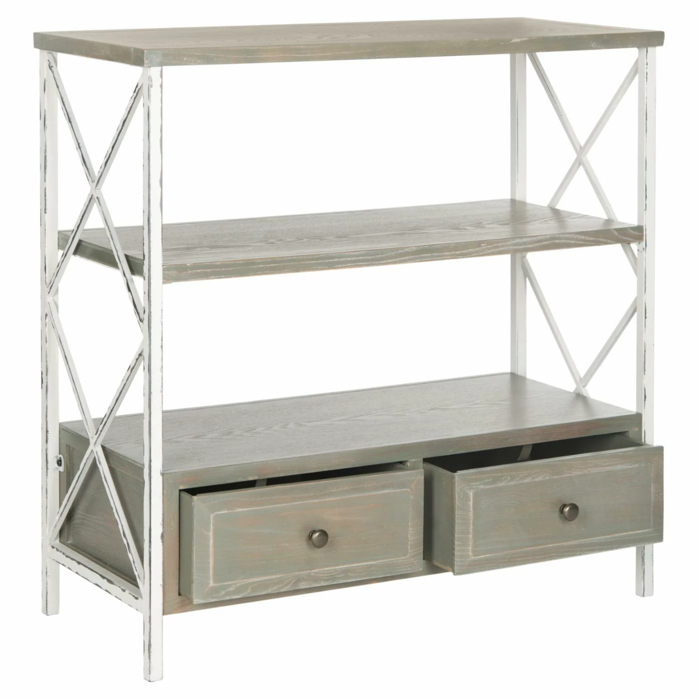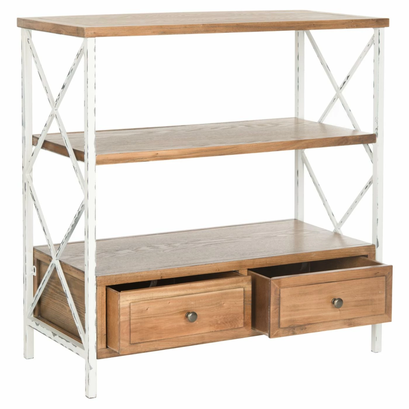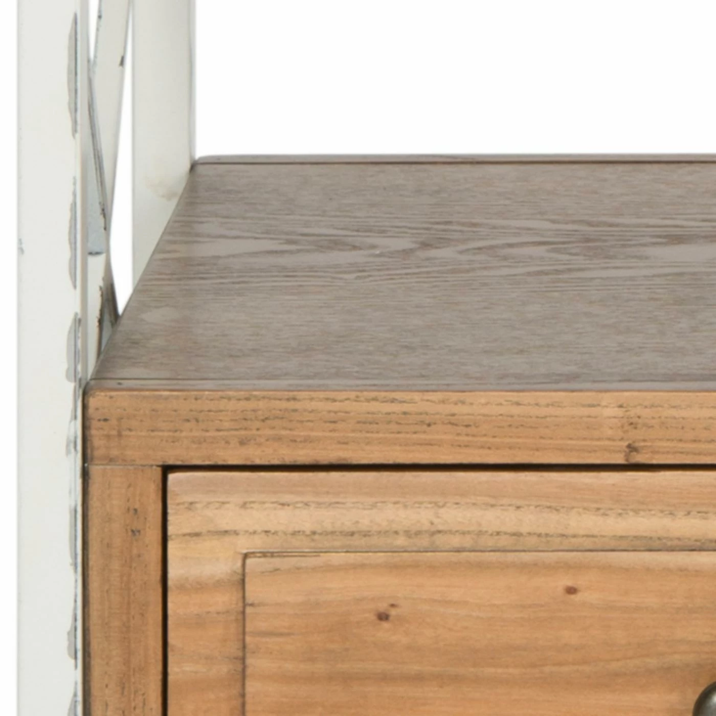 Inspired by the romance of French country design, the Safavieh Chandra Storage Console Table is elegant and rustic at once. The table, shelf, and lower double-drawer chest are fabricated out of engineered wood and solid pine and fir hardwoods for a natural grain effect. Crisscross iron legs in a distressed finish complete the design.