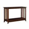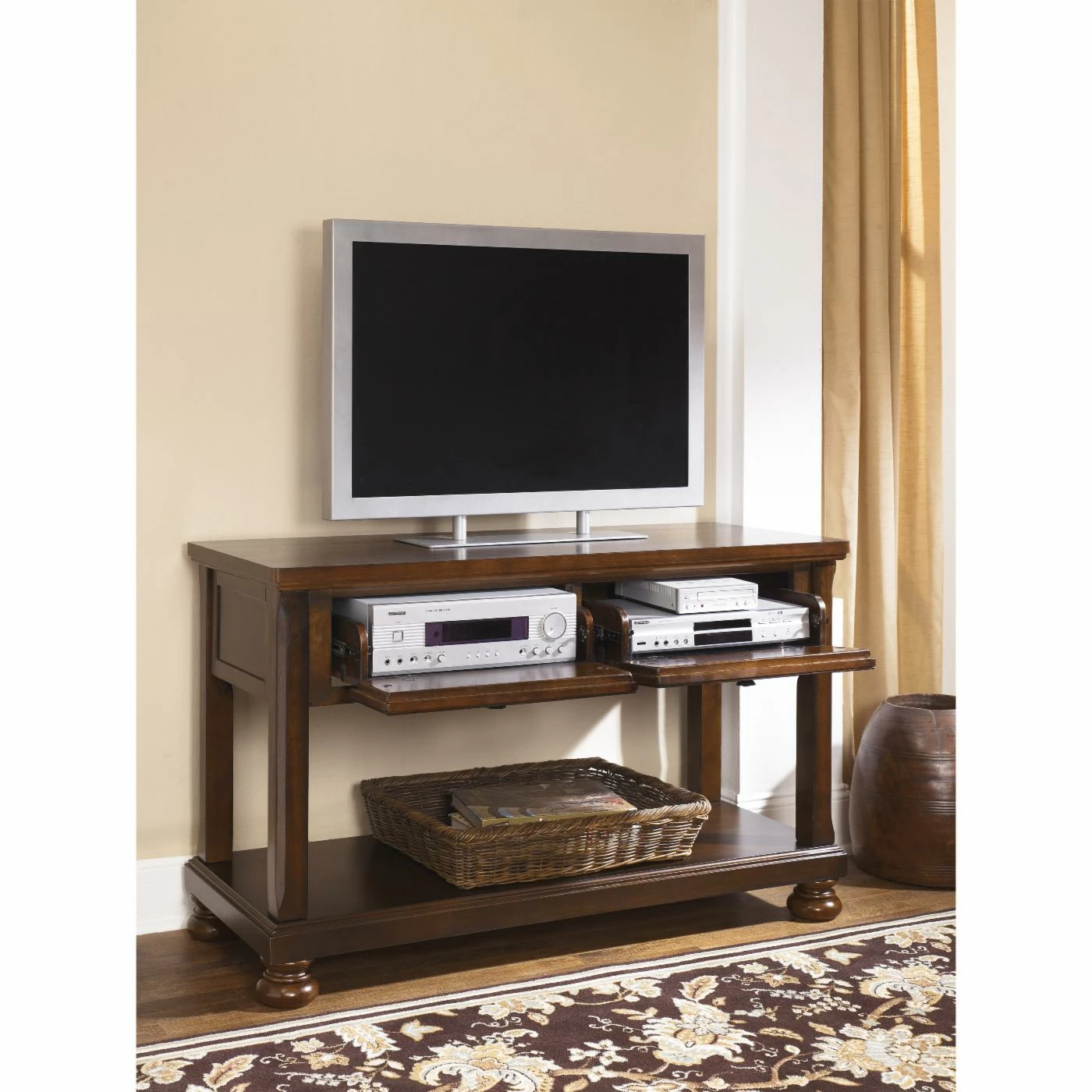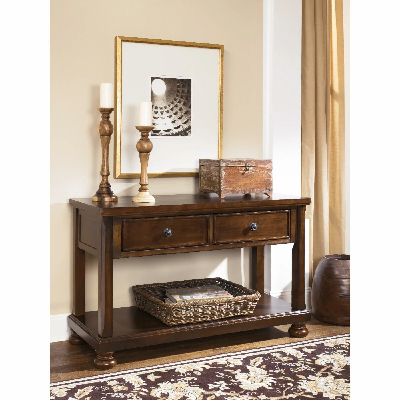 The Signature Design by Ashley Porter Console Table adds a finishing touch to any entryway, hallway, or living room. Beautifully crafted with a burnished finish, this handsome table exudes warmth. The classic bun feet and aged bronze-tone hardware add a touch of causal elegance. Front drawers provide a convenient catchall for smaller items, while the bottom shelf offers additional storage and display space.