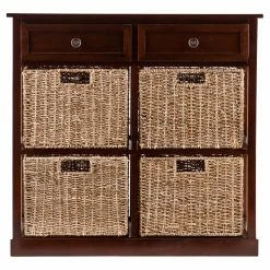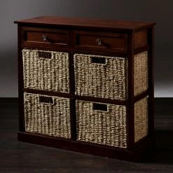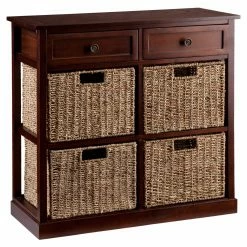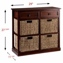 The casual and versatile Southern Enterprises Kenton Console Table with 4 Baskets works well with classic or contemporary dรฉcor. This console table is made of acacia wood and veneers in a rich mahogany finish. Storage lives in the two top drawers and within the four removable natural seagrass baskets.