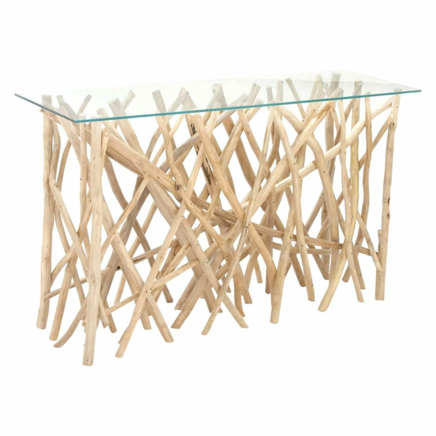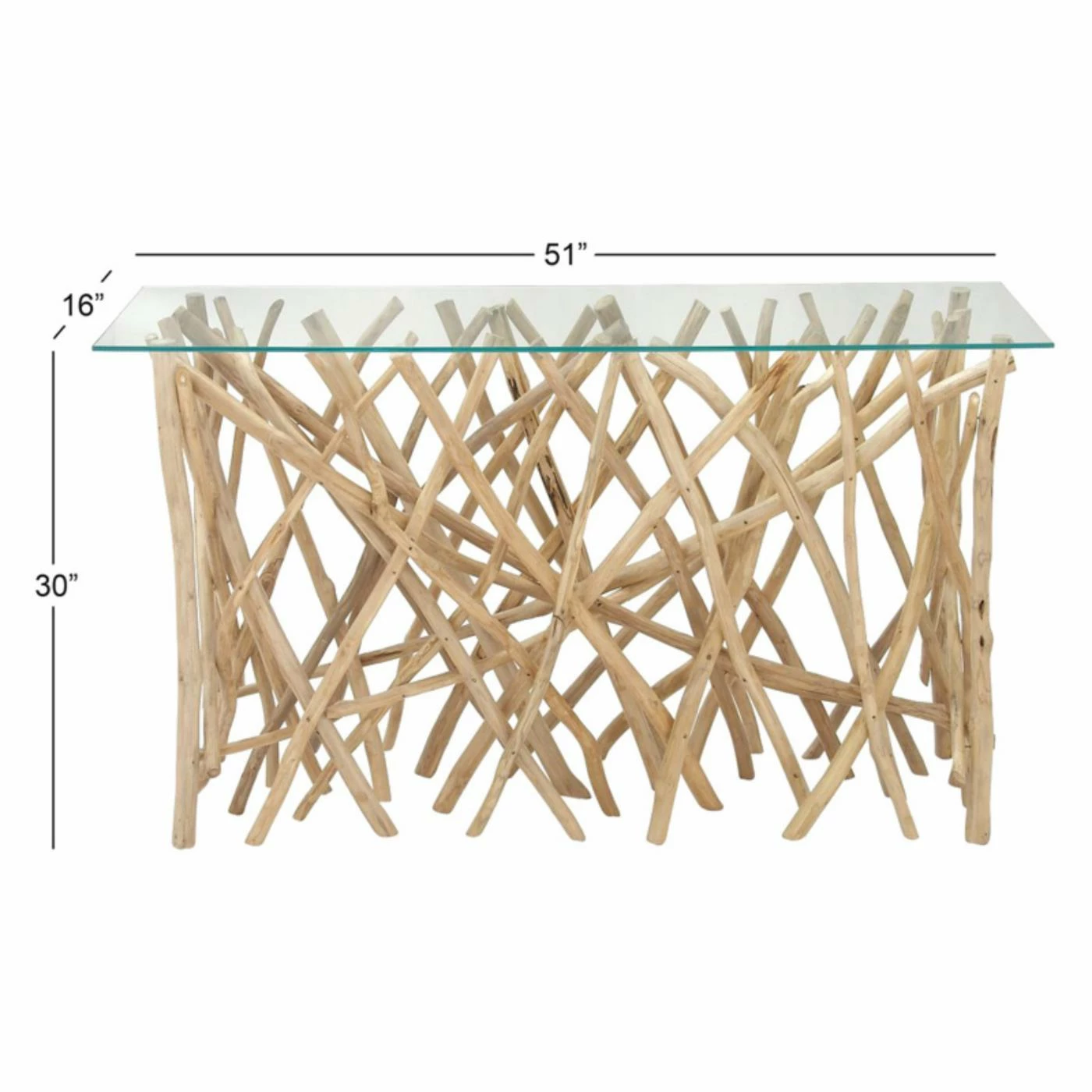 You’re looking for some extra storage and display space but don’t want to clutter your room’s design. The DecMode Teak Branch Console Table has the answer. This wide console table is a perfect way to prominently display candles, pictures, and more, featuring a spacious top that’s made from a flat sheet of clear tempered glass. The base is supported by dozens of interwoven branches, made from solid acacia wood and featuring a natural finish.