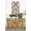 The Gallerie Decor Seaside Console Table is a stylish option for storage or display. Beautifully hand-crafted with cream colored legs and subtle distressing, this table brings a coastal look to any room. The three drawers and bottom shelf are designed with a plank look in soft tones of blue, gray, yellow, and white, adding to the seaside feel. Drawer knobs are made of wood. Easy assembly required for table legs.
