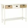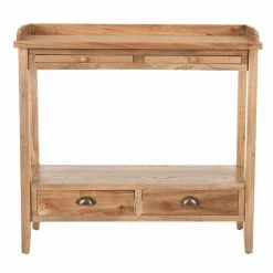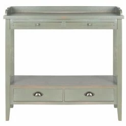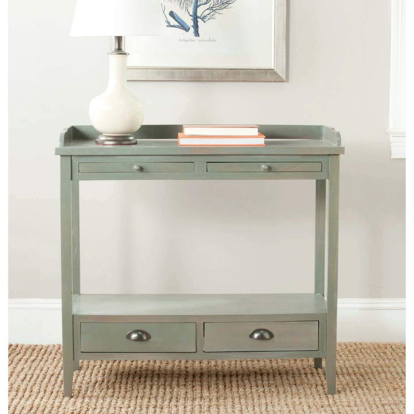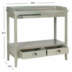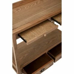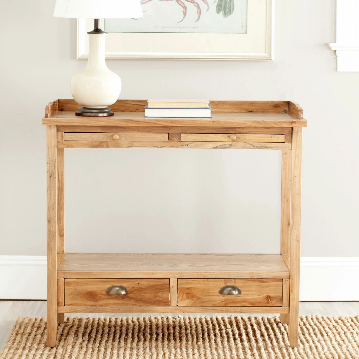 The perfect marriage of form and function, the HN Home Barnes Coastal Console with Storage Drawers adds the rustic look of Mission style furnishing designs to a room. Its top is enclosed on three sides to protect decorative items or a lamp, and beneath the top are two pull-out surfaces that can be used for writing or for serving drinks and snacks when you entertain. A full-width lower shelf provides a secondary open storage area. The sturdy elm wood piece is completed by two storage drawers with antiqued half-moon metal pulls. You can select your preferred finish from the available options when you order the console.