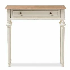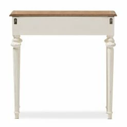 The HN Home Seneca Coastal Weathered Oak and Distressed White Wash Console Table offers an endlessly fashionable piece that looks great in both traditional and reclaimed-style settings. The hardy frame is crafted from engineered wood with attractive fluted legs. A wide, roomy pull-out drawer is incorporated into the apron, and outfitted with round, brass-finished metal knob handles. The base of the piece is finished in a crisp white-washed hue, while the table top is finished in a handsome distressed oak.