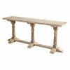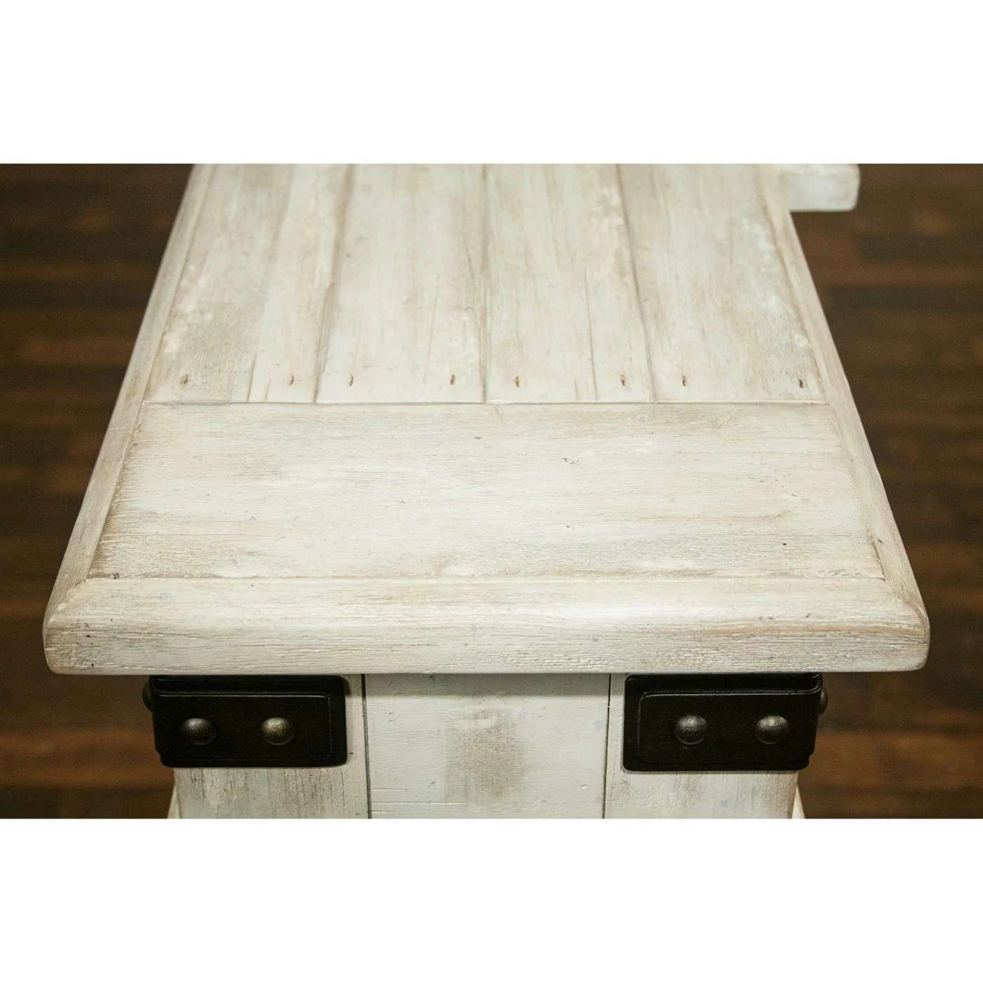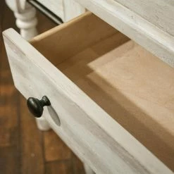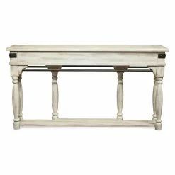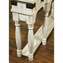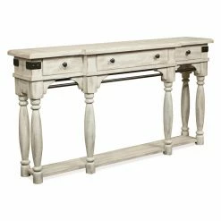 A spectacular classical storage option, the Riverside Furniture Regan Console Table is poised to make your living room more functional and fashionable. This wide console table comes constructed from tough hardwood solids with classical turned legs. Rich veneers top the wood, finished in distressed white. The tabletop has a three-dimensional stepped look with three storage drawers built into its face. Each drawer has metal knob handles, ball-bearing glides, and a dovetail construction. Metal corner caps and rod stretchers add to the look, finished in gray.