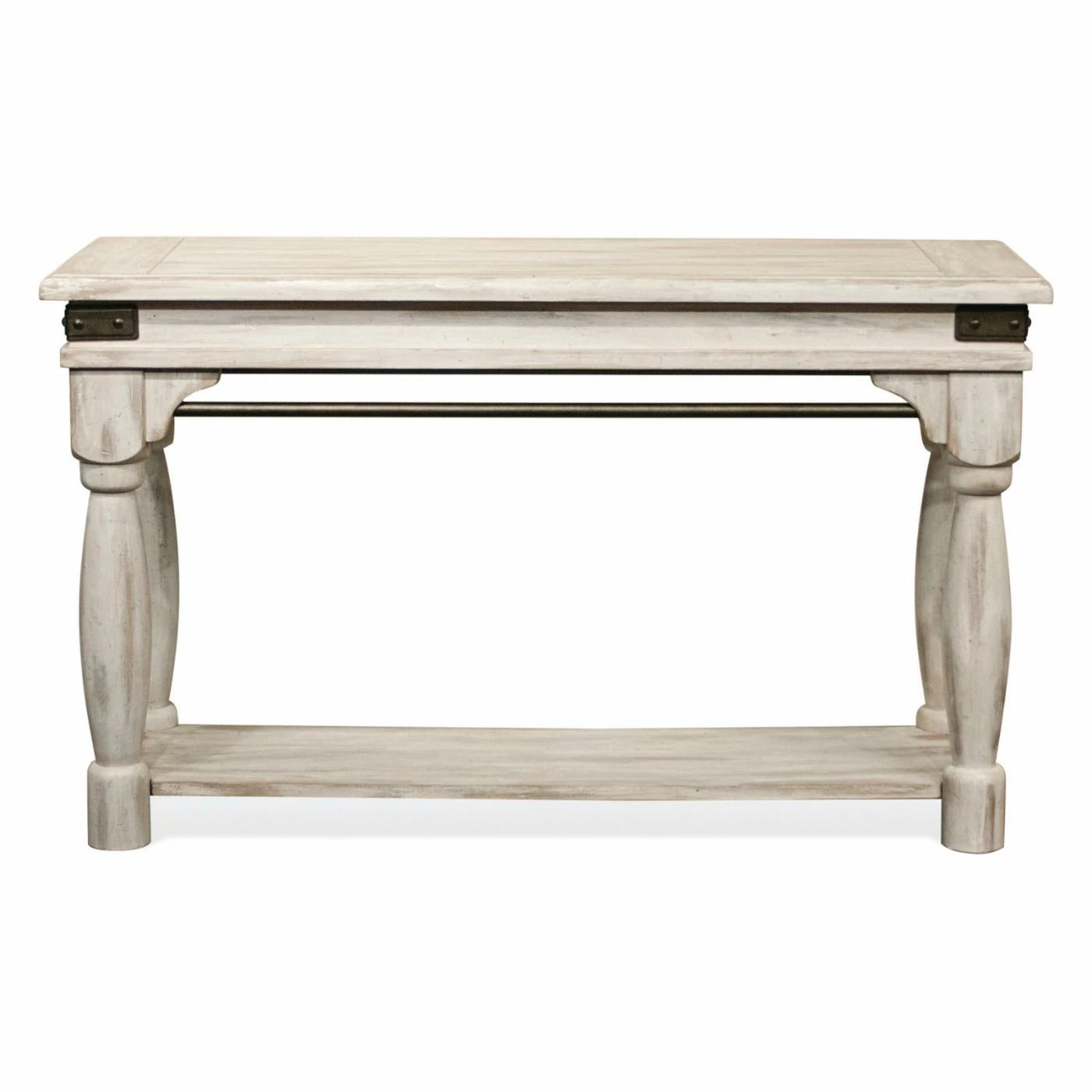 Provide your living room with the perfect finishing touch with the Riverside Furniture Regan Sofa Table. This charming sofa table looks great with modern and classical furniture alike. Its rectangular frame is built from thick hardwood with an expansive lower shelf and shapely legs. A metal stretchers and metal corner caps lend some visual dynamism to the look, finished in gray. The frame is topped by select veneers and then finished in a distressed white color.