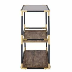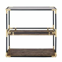 From hallways to bedrooms, the Acme Furniture Heleris Console Table is proof that style and function can go hand in hand. The durable construction boasts a sturdy metal frame and plenty of open shelving for displaying your favorite decorative items or books. The tinted glass top and gold-finished accents complement the wood finished shelves, which add a warm and inviting vibe to this console table.