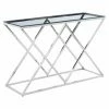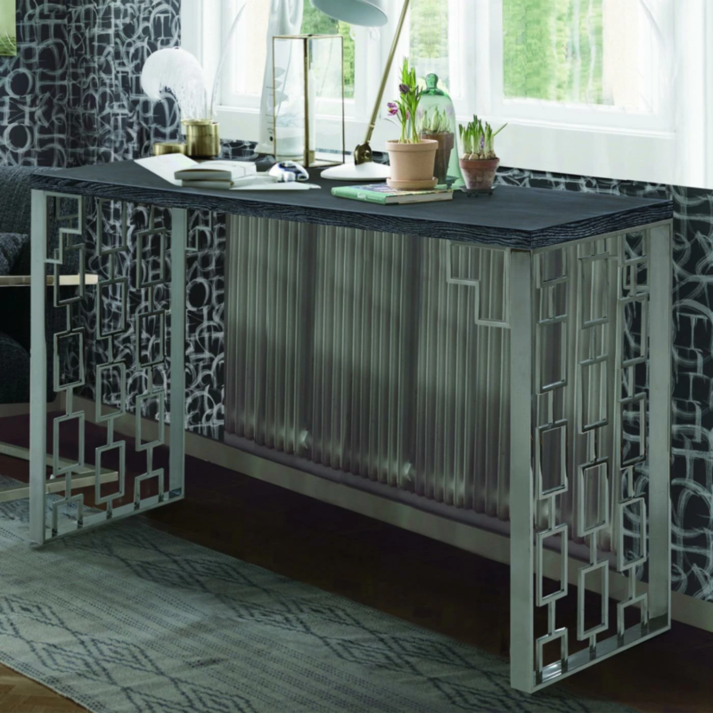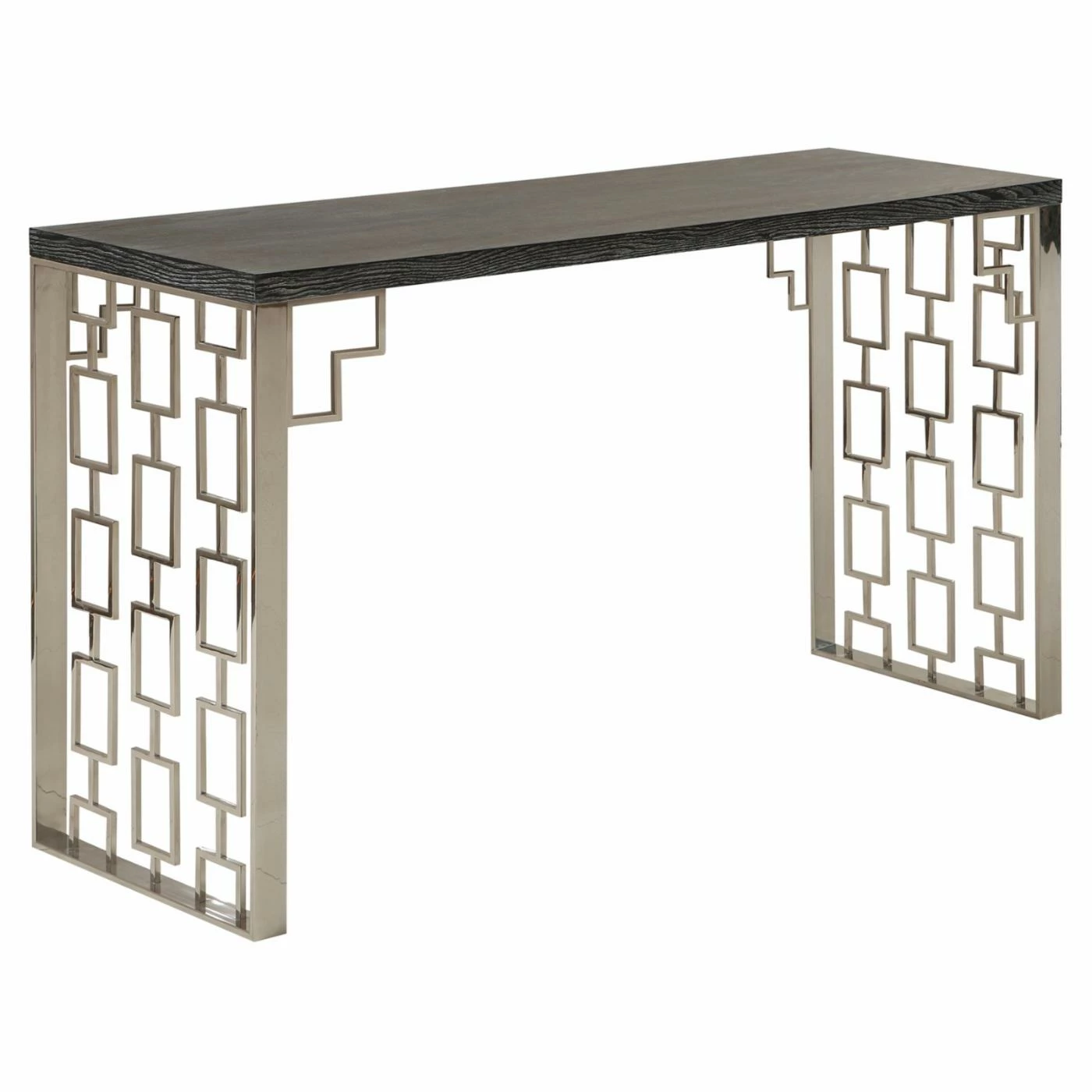Make a marvelously mod statement with the Armen Living Skyline Console Table. Ideal for hallways, entryways, the backs of sofas, and more, this console table combines a laser-cut stainless steel base with an open-pored engineered wood top with ash veneers. Your choice of finish option creates a cool contrast, and the cutout square pattern adds even more glam.