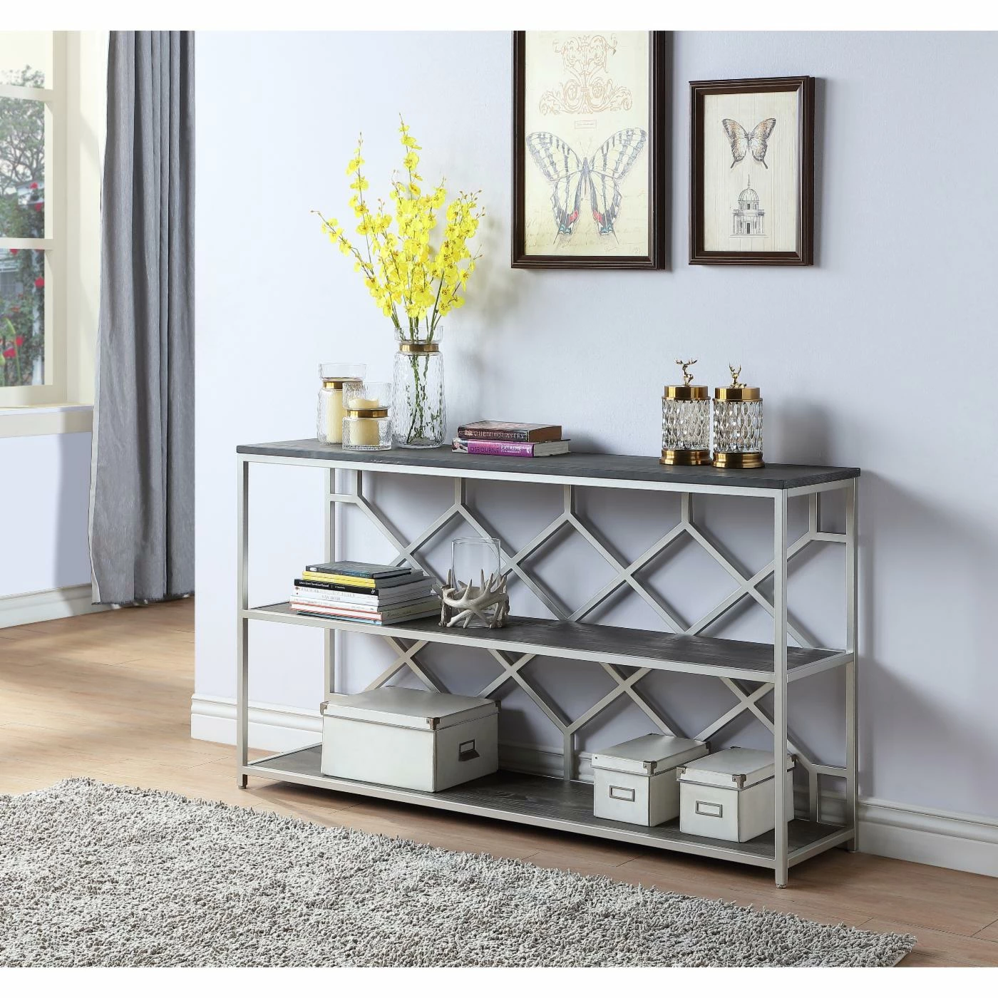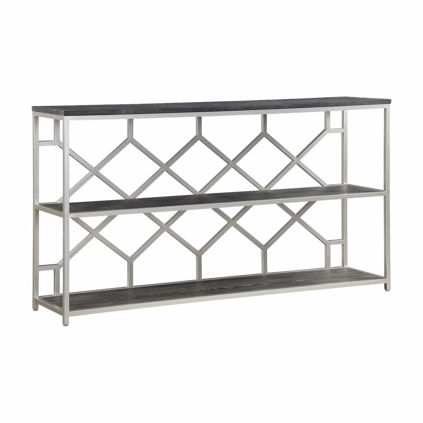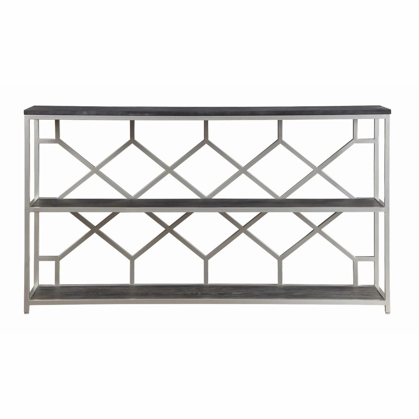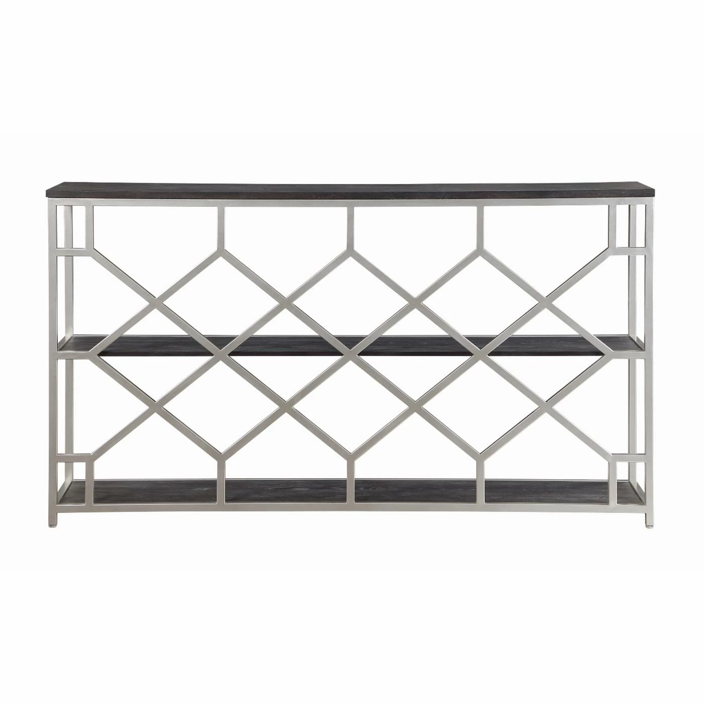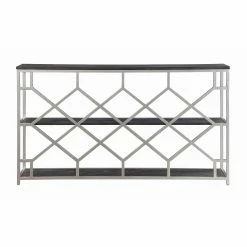 The best pieces of furniture are like the Coast to Coast Toro Console Table: they aren’t just functional, they also add to your overall design scheme. The open diamond-patterned back makes the table seem even more slender than it actually is. Store your favorite books, vases, candles, and other decorative objects along the three tiers. The silver finish of the frame is lightly echoed in the wood’s rub through finish, which enhances the drama of the wood grain pattern.
