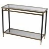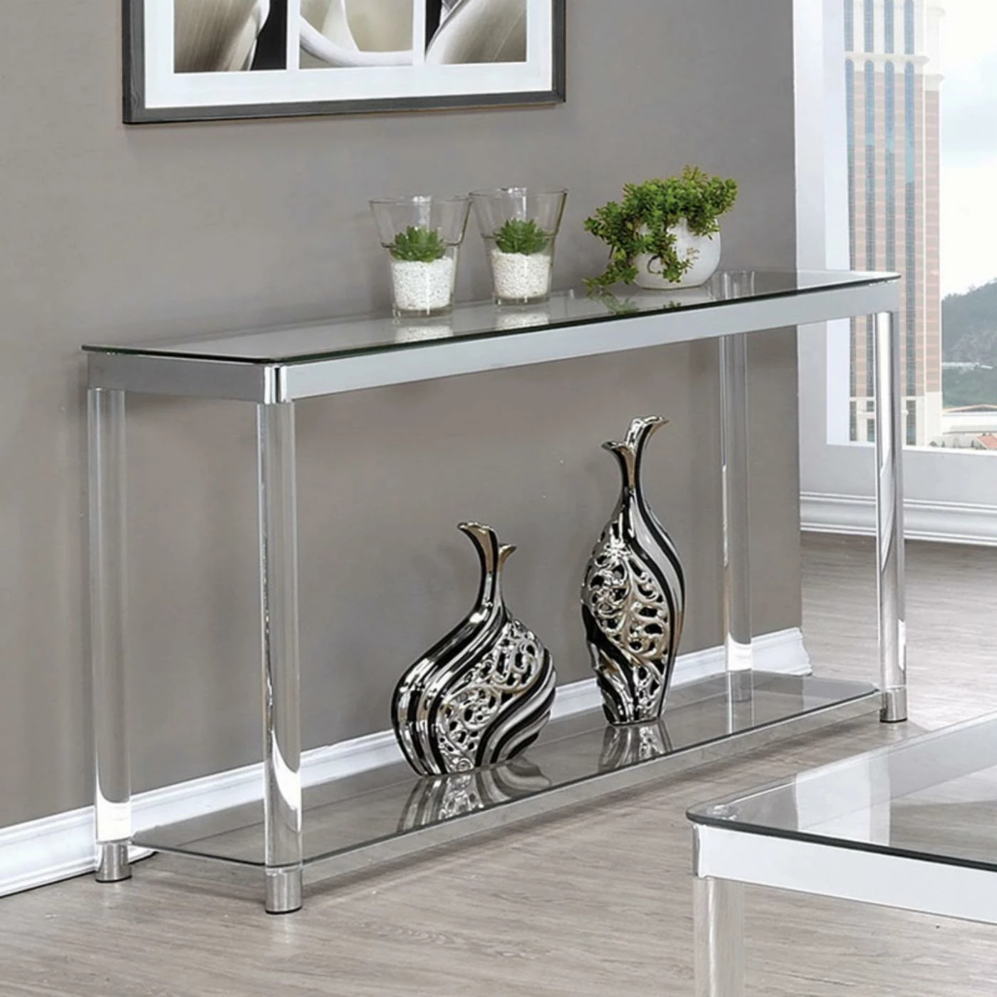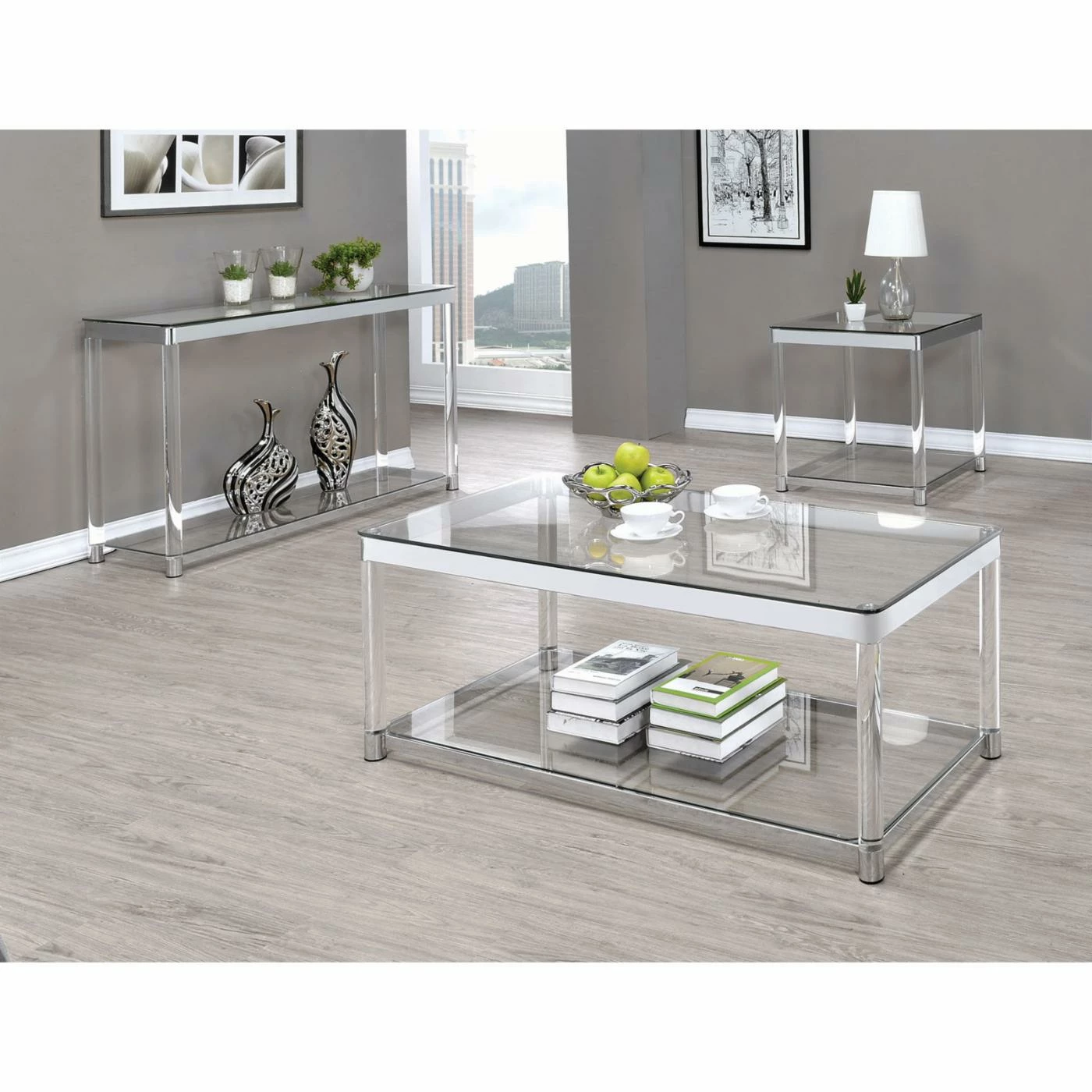 The Coaster Furniture Contemporary Sofa Table includes a metal construction and sturdy glass tabletop. Its clear finish adds contemporary style to your home. A convenient shelf provides storage space.