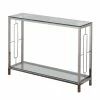 Sleek metal and glass accents define the Coaster Furniture Glass Top Sofa Table with Glass Shelf. Featuring two shelves for storage and a glass tabletop for function and appeal. Ornate metal scrollwork adds intrigue to this elegant piece.