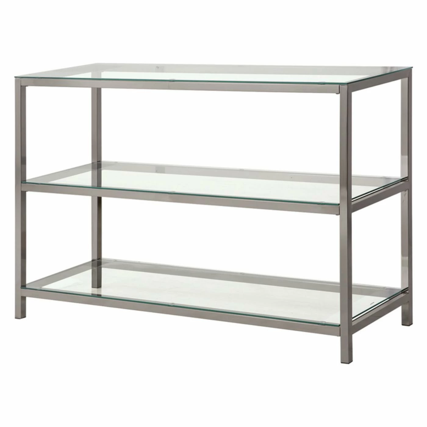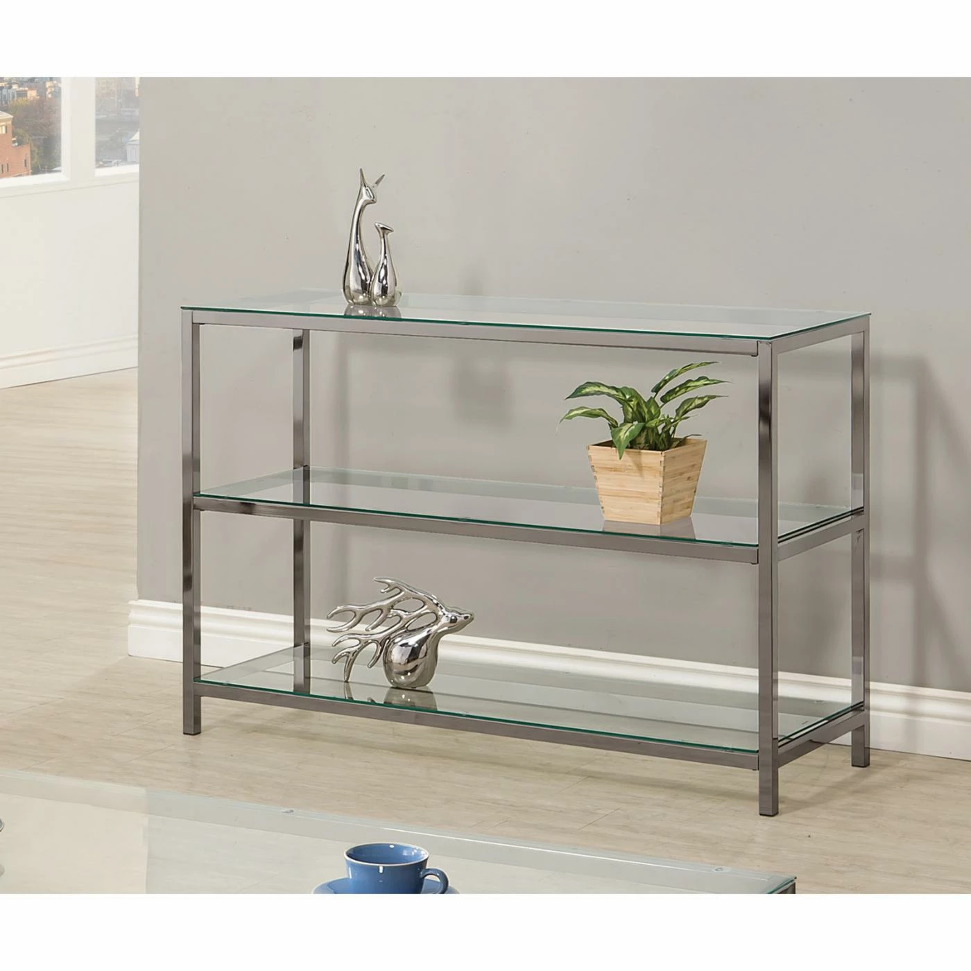 The Coaster Furniture Glass Top Console Table with 2 Glass Shelves features two glass shelves capable of holding decorative accents, books, and more. The tempered glass tabletop and metal frame add a contemporary touch to your space. This console table’s sleek construction allows it to blend seamlessly into many homes.