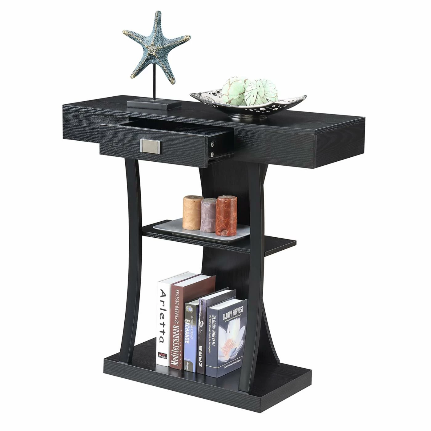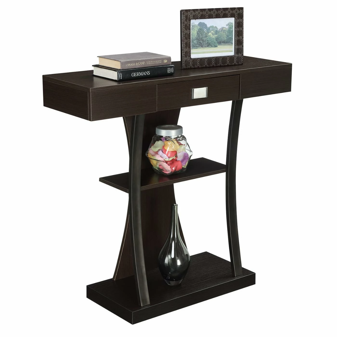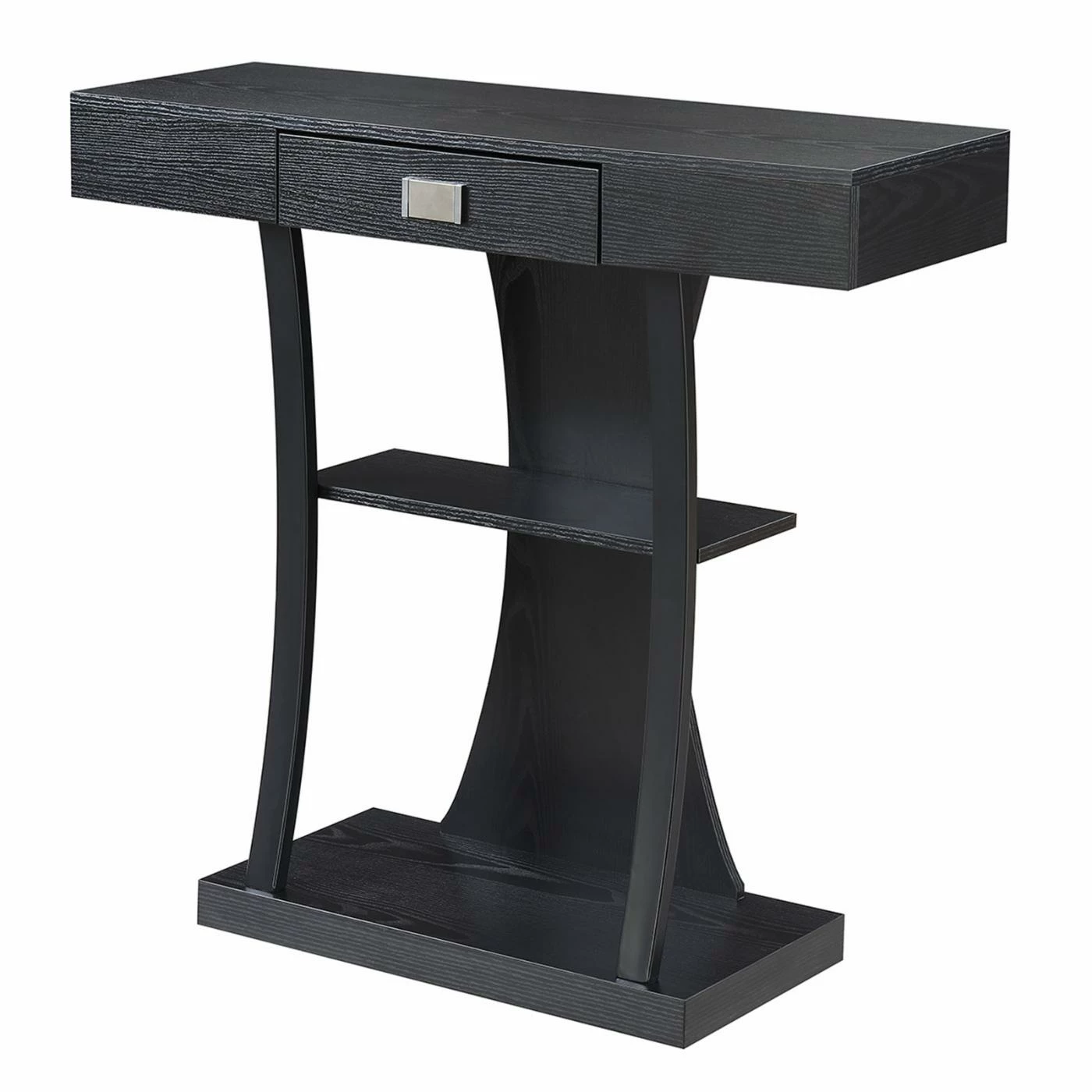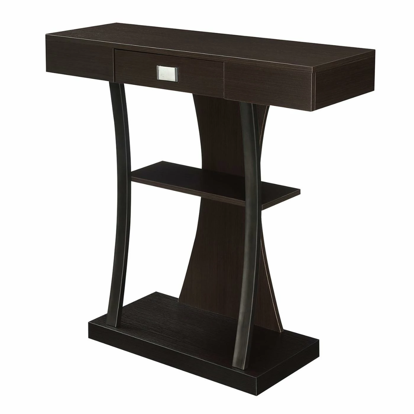 A rich espresso finish and unusual shape adds modern style to your home with the Convenience Concepts Newport Harri Console Table. This handsome console table has a roomy bottom and center open shelf to show off tall vases, framed photos, books, and much more. The smooth rectangular top section includes a center drawer for hidden storage and features a large metal pull for additional contemporary style. The curvy back piece and curved supportive frame gives it a whimsical finishing touch.