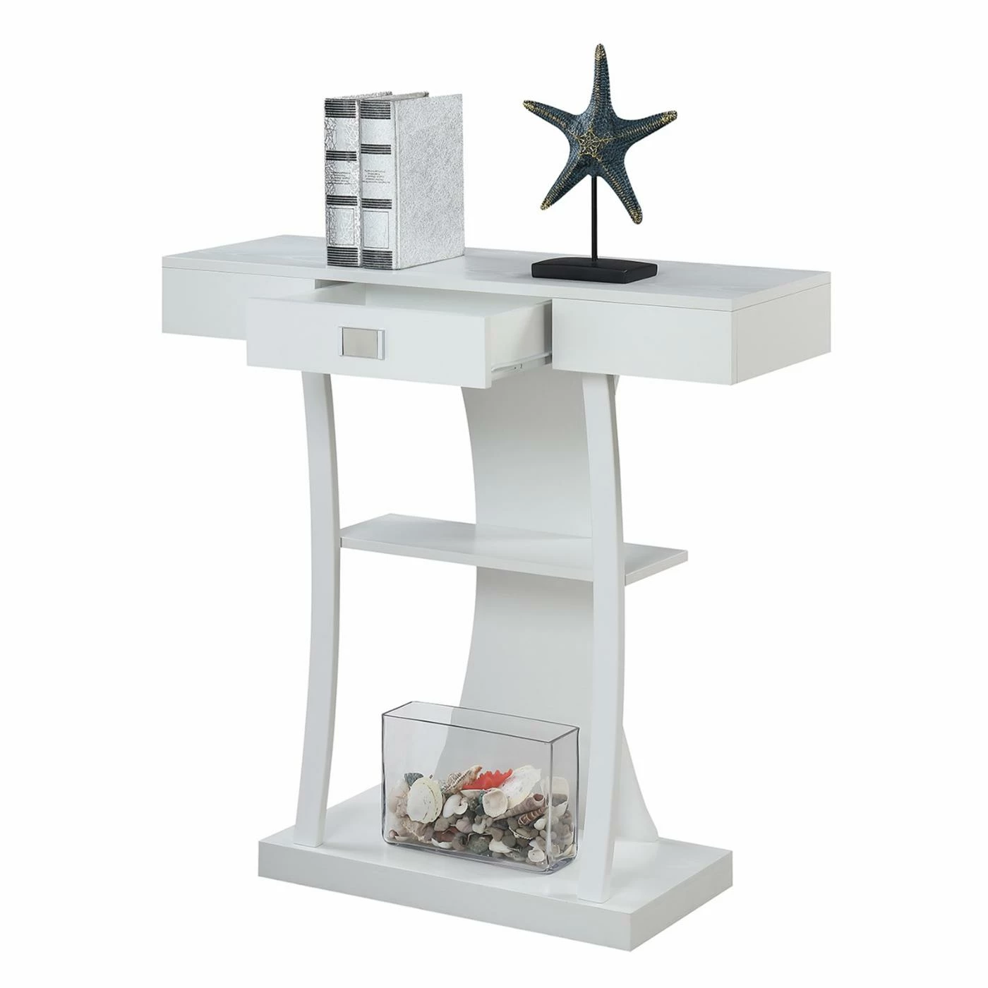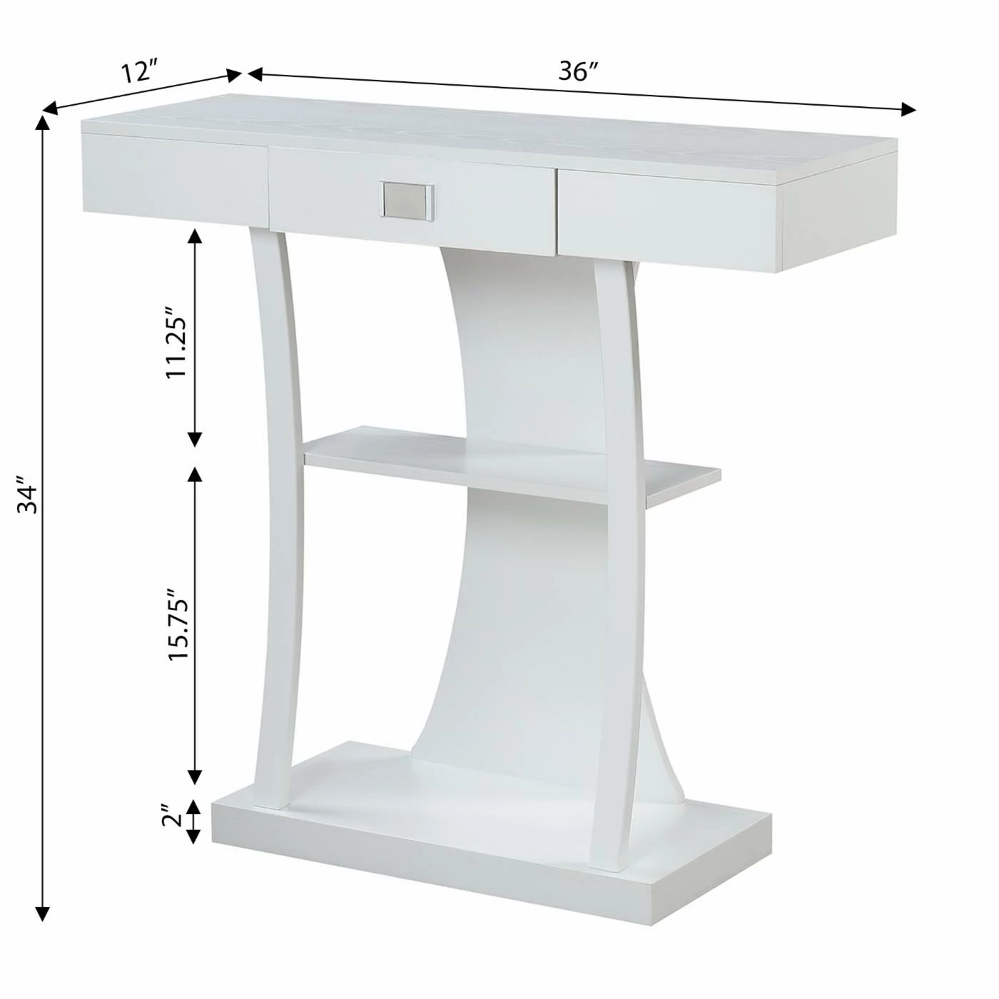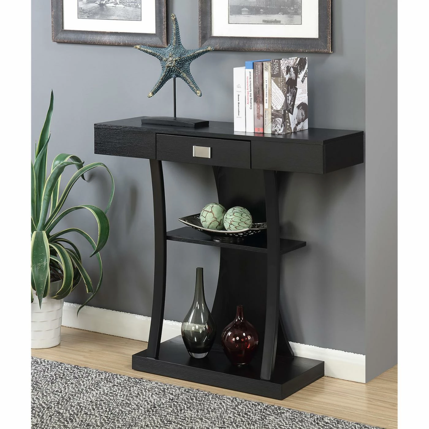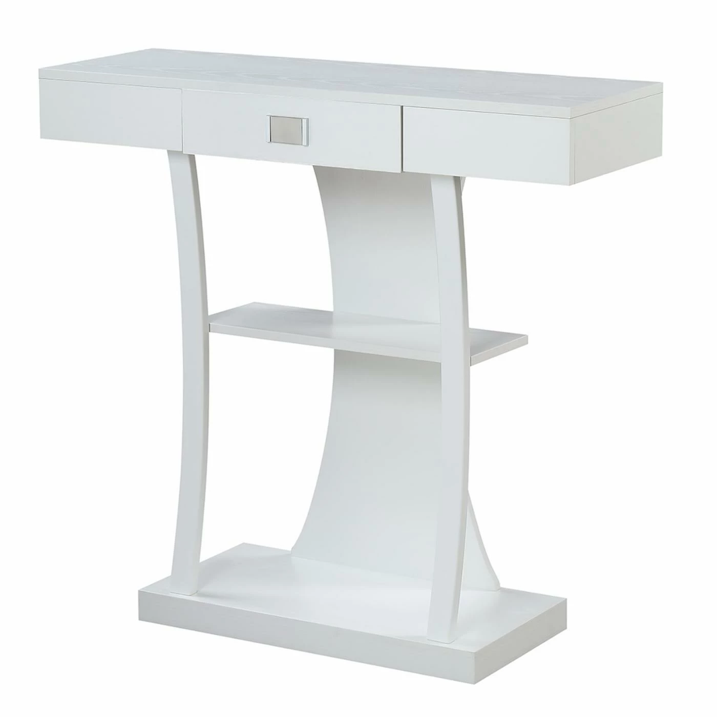 A rich espresso finish and unusual shape adds modern style to your home with the Convenience Concepts Newport Harri Console Table. This handsome console table has a roomy bottom and center open shelf to show off tall vases, framed photos, books, and much more. The smooth rectangular top section includes a center drawer for hidden storage and features a large metal pull for additional contemporary style. The curvy back piece and curved supportive frame gives it a whimsical finishing touch.