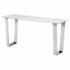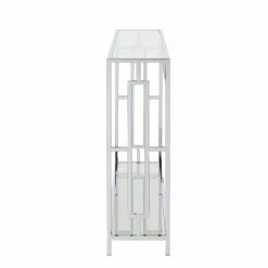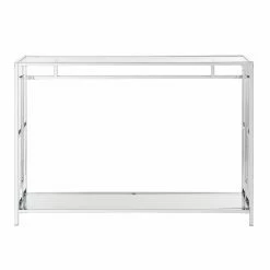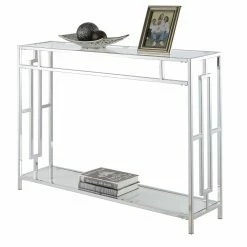 Turn that bare stretch of wall into a dazzling display space with the Convenience Concepts Town Square Console Table. This console table is an exciting modern update for your living room or hall. Its frame is built from squared metal and is topped by a polished chrome finish for a mirror-like shine. Open square details accent the apron and sides. Both the wide tabletop and matching lower shelf are crafted from thick, clear tempered glass.