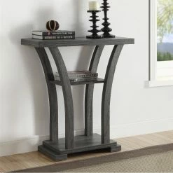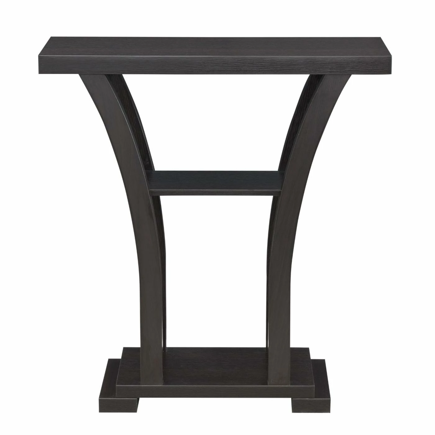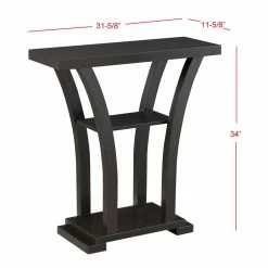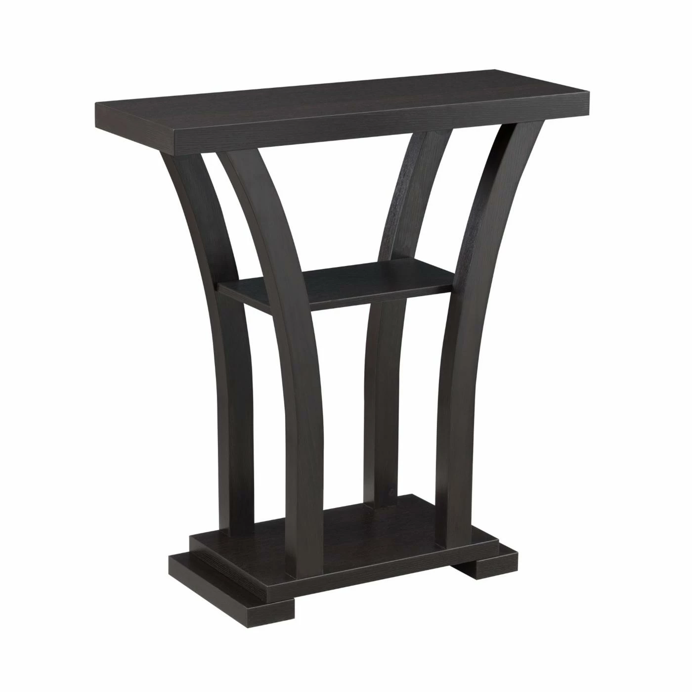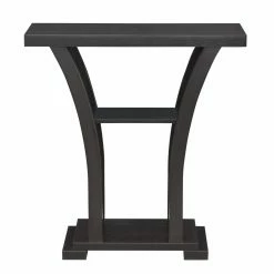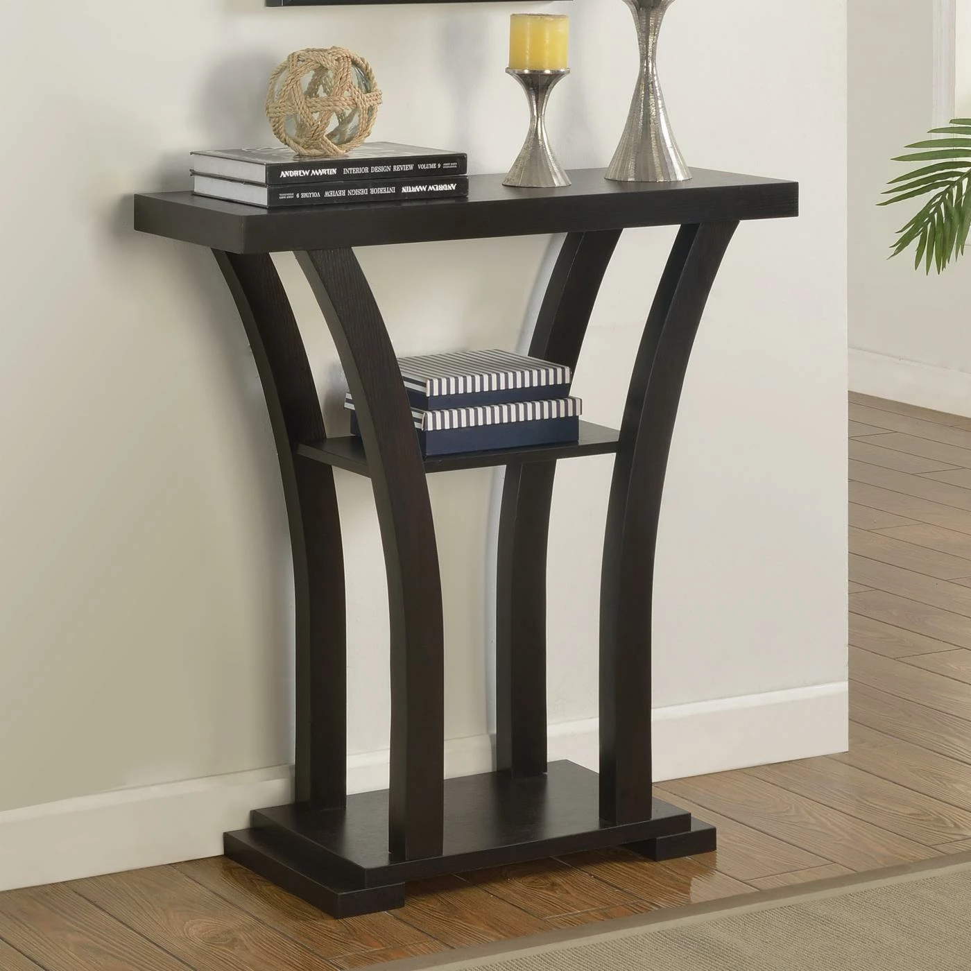 Curved lines lead your eye to the top of the Crown Mark Draper Rectangular Console Table. The spacious tabletop will hold all of your decorative pieces, a lamp, and candles. This table has a shelf in the middle and space on the bottom for even more items. This intricately designed table is constructed from melamine wood. This console table comes in your choice of available finish options, so you will find the best match for your home.