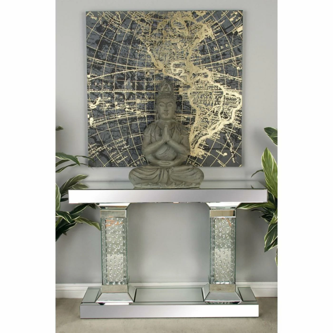 The DecMode Crystal Pedestal Rectangular Console Table is a darling addition to your living room dΓ©cor, making your design scheme brighter and more beautiful. This table features two pillar supports made from pitted glass and is otherwise crafted from medium-density fiberboard. The tabletop and base come paneled with reflective mirrors. Use this on its own or as a display space for your favorite decorative items.