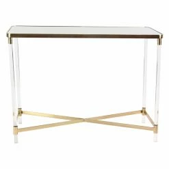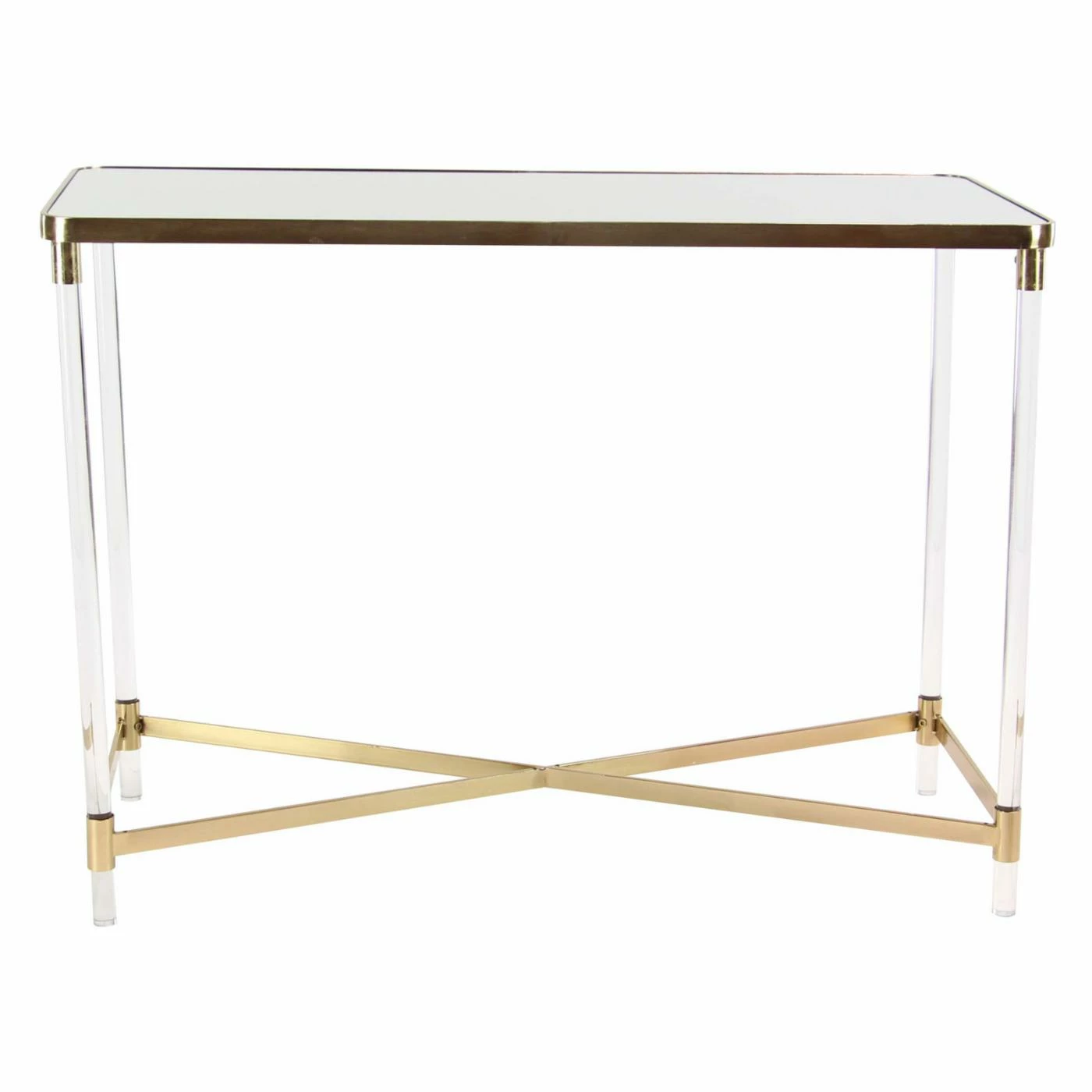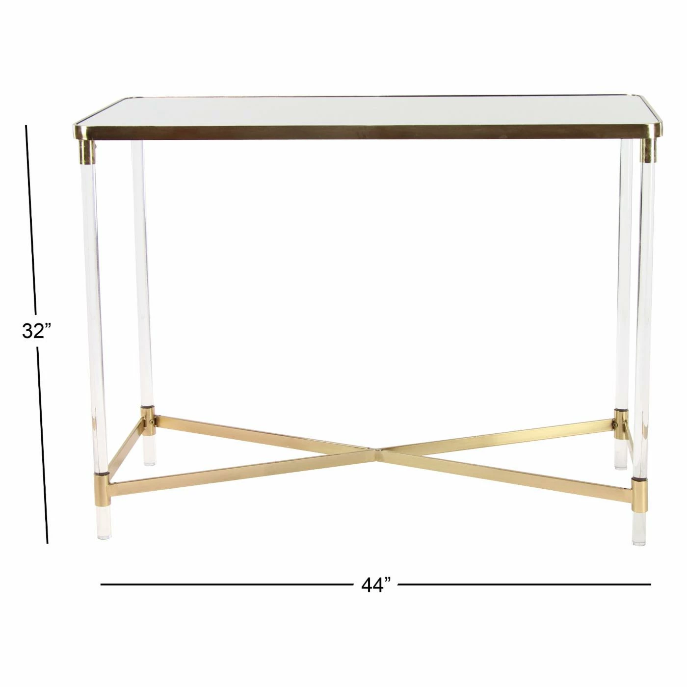 The DecMode Modern Iron and Acrylic Rectangular Mirror Console Table showcases the beauty of metallic touches. This console table rests on four cylindrical, clear acrylic legs. A gold finish adorns the X-shaped iron base and frames the mirrored surface. This console table adds a contemporary touch to your entryway or living space.