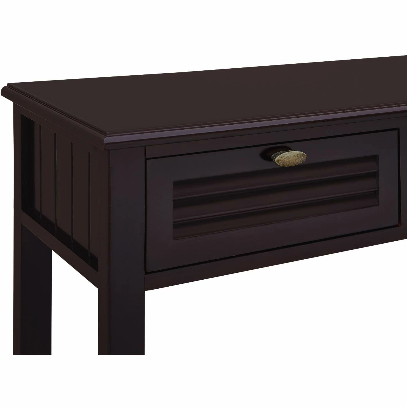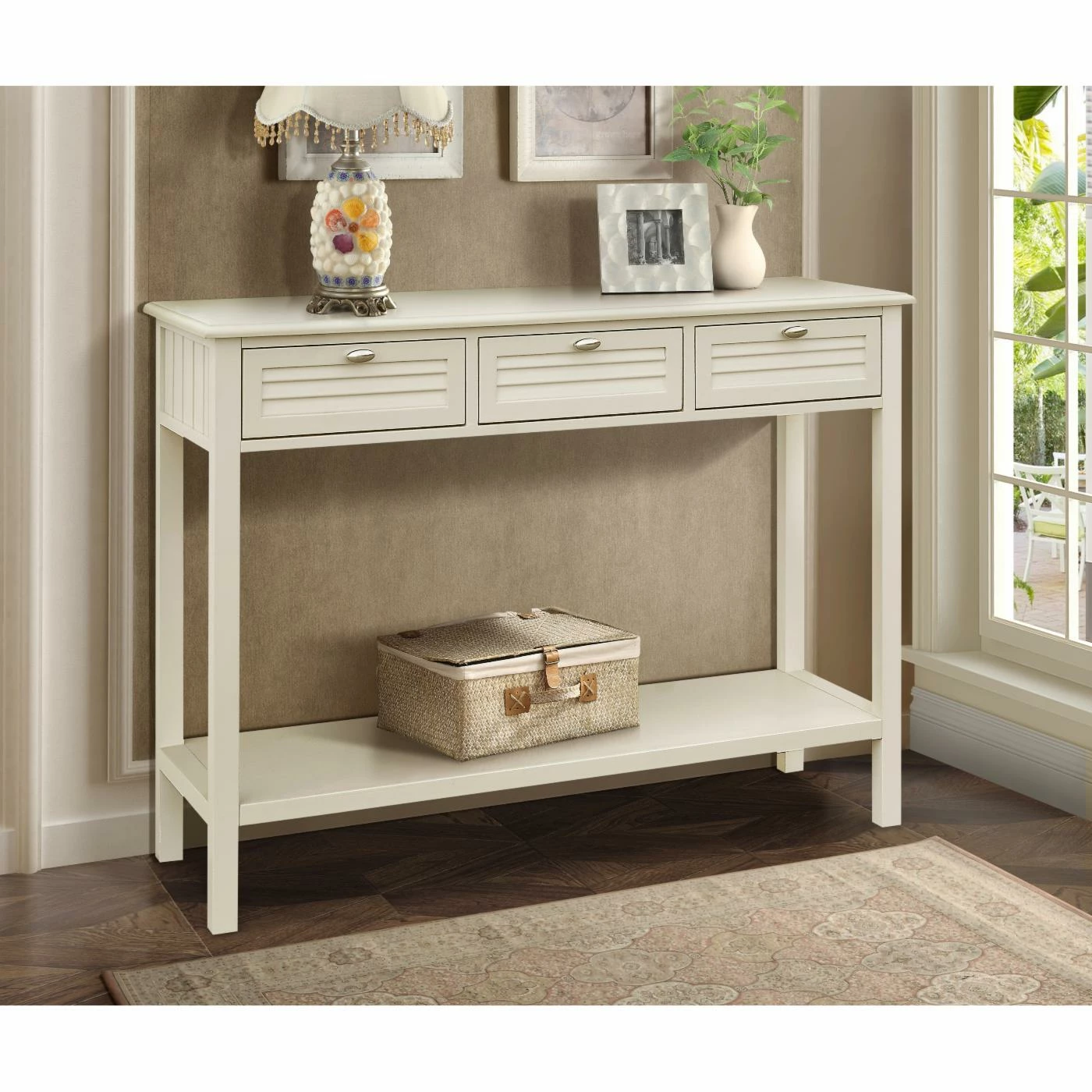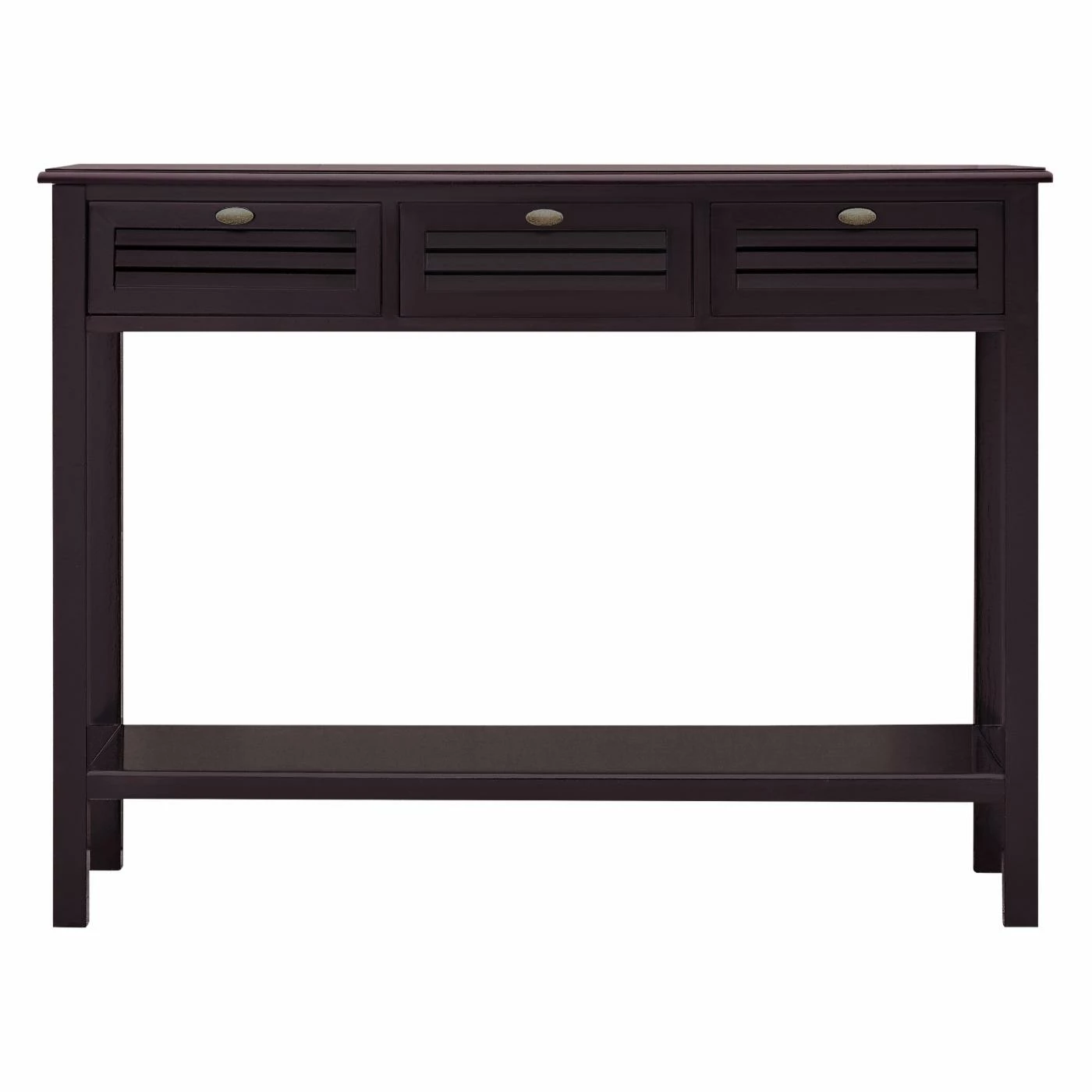 Enjoy the handcrafted wood construction and streamlined classic design of the Gallerie Decor Chelsea Console Table in any living room, dining room, or transitional area. The beauty of this piece is how well it fits into any space to add depth and function. Place in an entryway as an attractive catch-all table, behind the couch as a console table, or add to a dining or kitchen space for a bit of extra storage. The smooth tabletop surface allows for lamps, books, or other items, and the open lower shelf is perfect for storage and display. Three small drawers add to the functionality of the piece, while the louvered fronts and oval metal drawer pulls add to the aesthetic. Enjoy on its own or with other pieces in the Gallerie furniture collection.