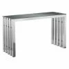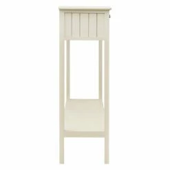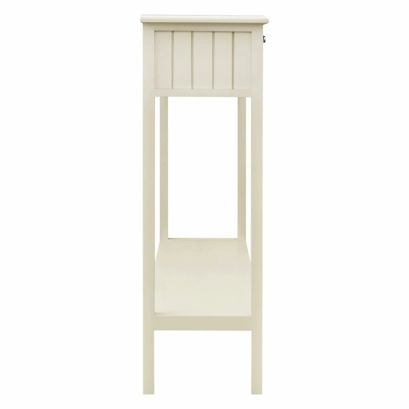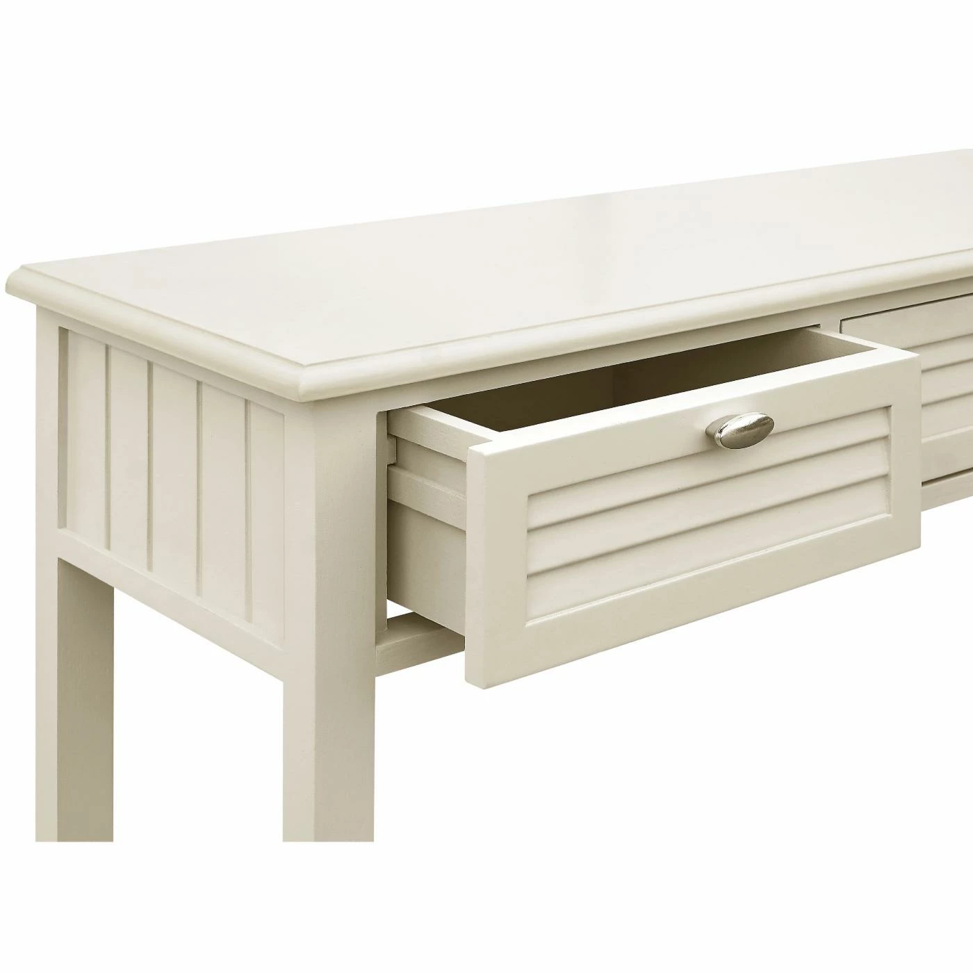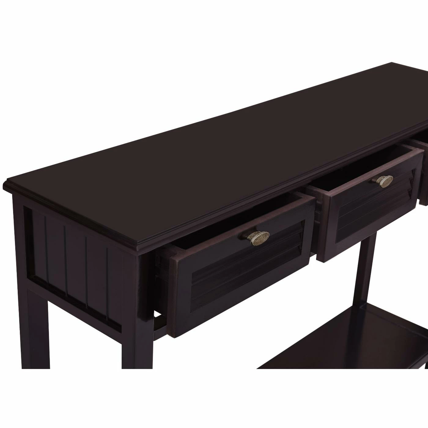 Enjoy the handcrafted wood construction and streamlined classic design of the Gallerie Decor Chelsea Console Table in any living room, dining room, or transitional area. The beauty of this piece is how well it fits into any space to add depth and function. Place in an entryway as an attractive catch-all table, behind the couch as a console table, or add to a dining or kitchen space for a bit of extra storage. The smooth tabletop surface allows for lamps, books, or other items, and the open lower shelf is perfect for storage and display. Three small drawers add to the functionality of the piece, while the louvered fronts and oval metal drawer pulls add to the aesthetic. Enjoy on its own or with other pieces in the Gallerie furniture collection.