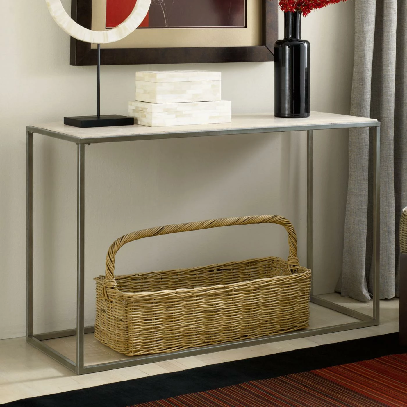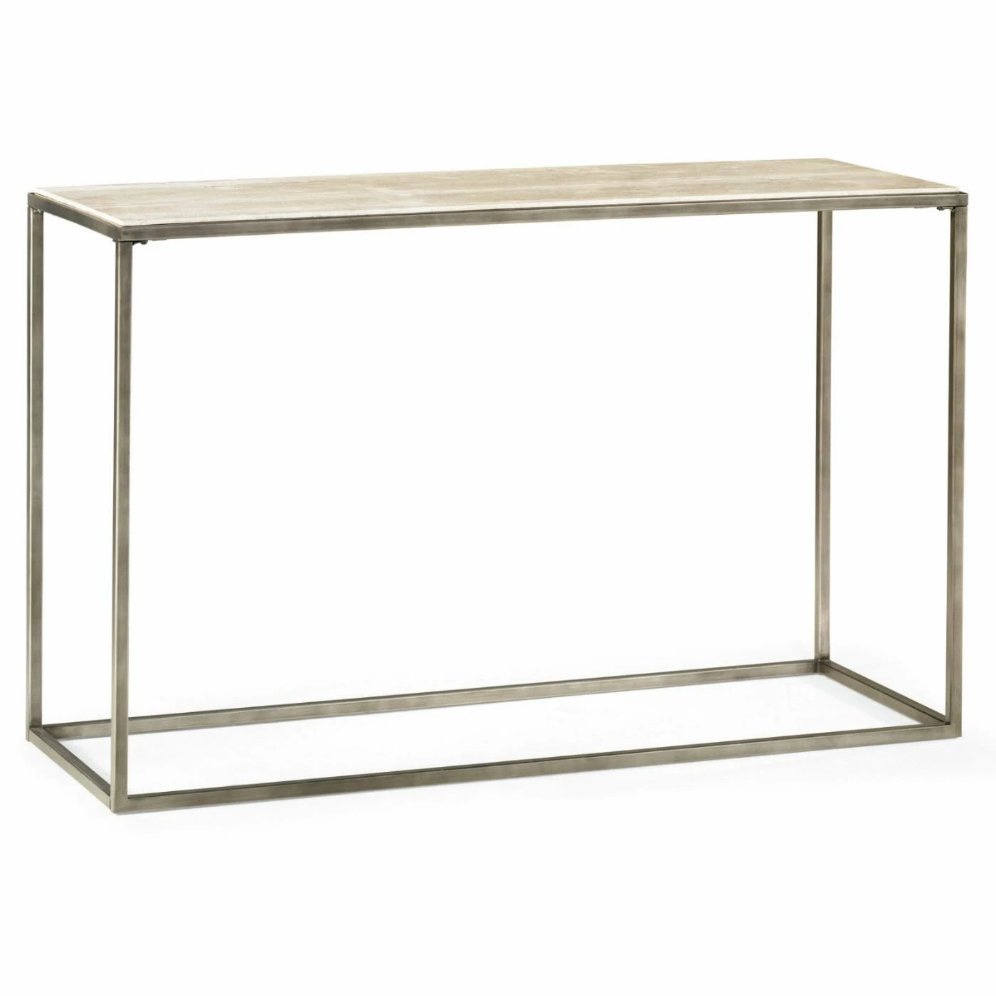 Utilize the space behind your sofa with this airy Hammary Modern Basics Sofa Table – Natural Travertine / Textured Bronze. The open metal base is topped with natural travertine stone for an industrial look.
