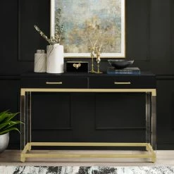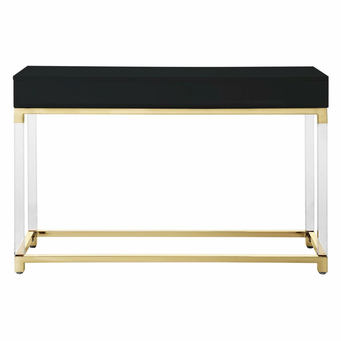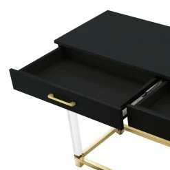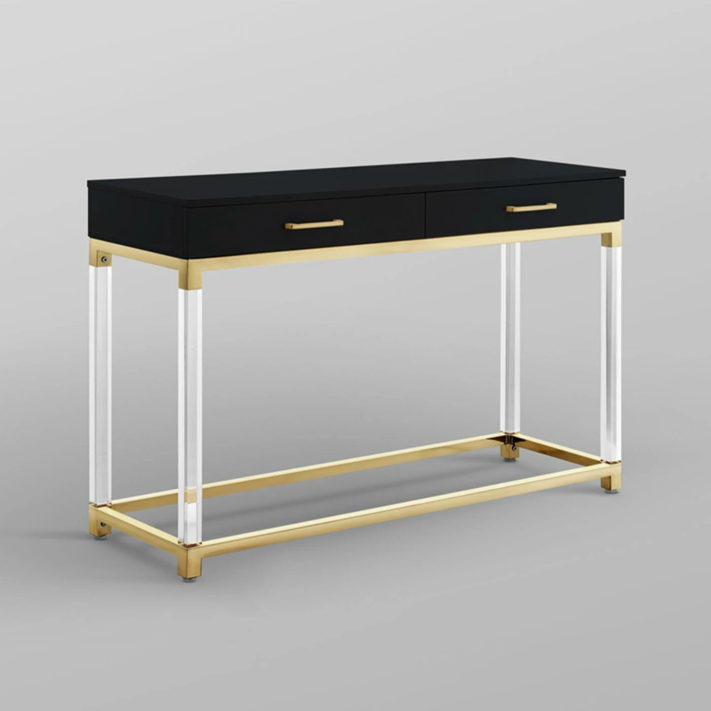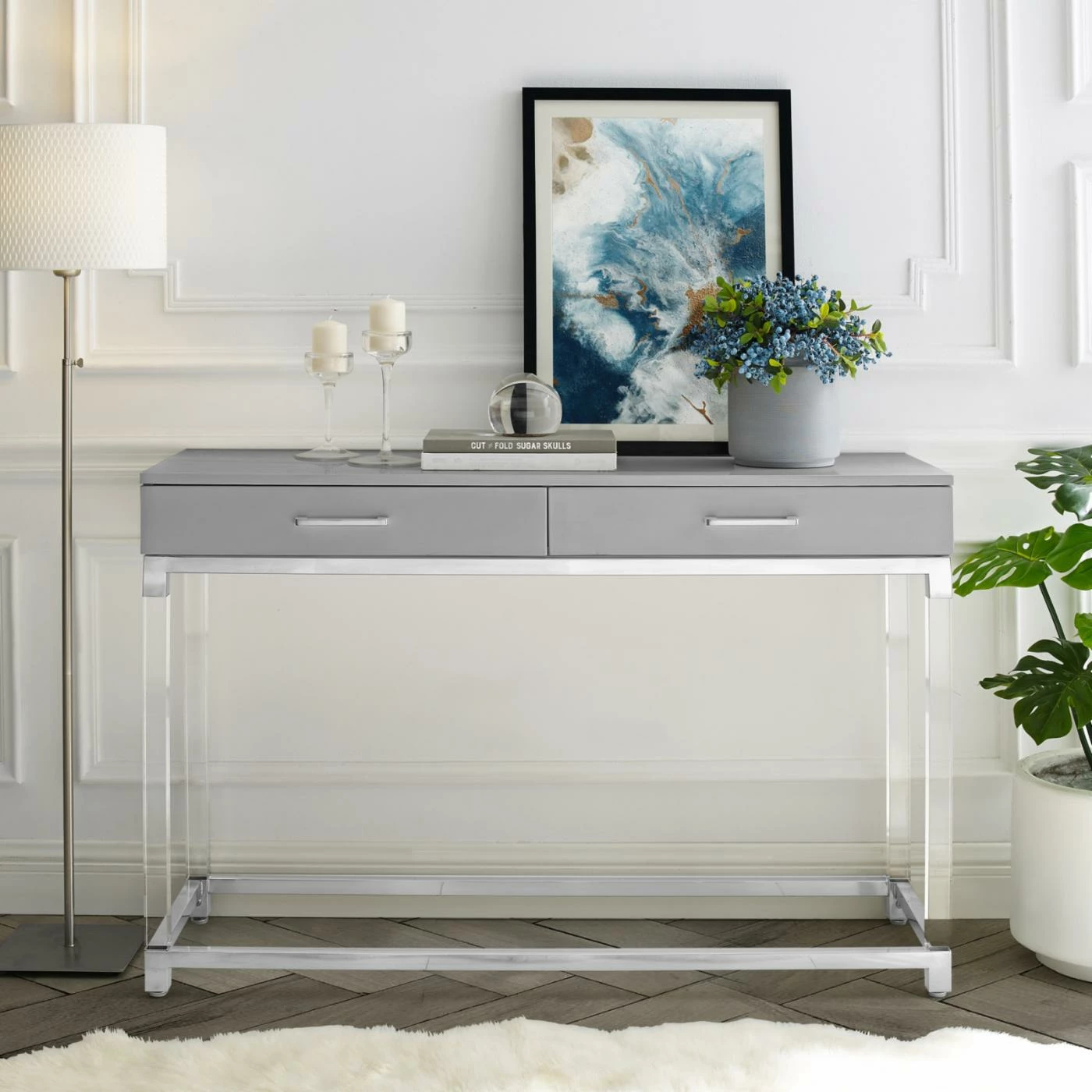 Elevate your home with glam style from the Inspired Home Davion 2 Drawer Console Table while simultaneously organizing your knick-knacks and small decorative items. This console table is constructed with an acrylic and metal base and engineered wood top. This rectangular table arrives in your choice of available finish option to complement your current living room or entryway style. Pair this console table with other items from the Davion Collection for a complete look in your home.