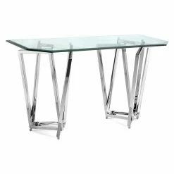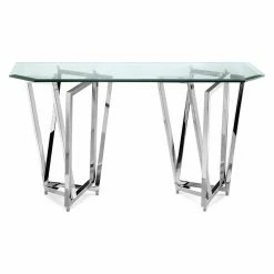 This Magnussen T3790 Lenox Square Octagonal Sofa Table features double the fun of its Lenox collection brethren with its two rectangular and intermingled bases that anchor a glimmering tempered glass top. A fun console table that would surely feel at home in an art gallery, this shining piece of furniture features a chrome-plated nickel construction. The 50-inch-wide octagonal table is versatile by nature and fits neatly in living rooms, dining rooms, and bedrooms. Its tempered glass top is twelve millimeters thick and includes a one-inch bevel, making it sturdy enough to hold your favorite personal display items, such as picture frames, plants, and books.