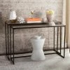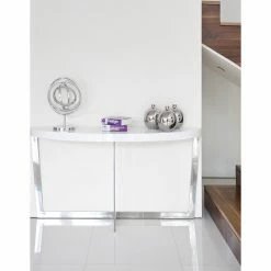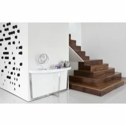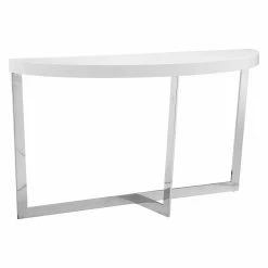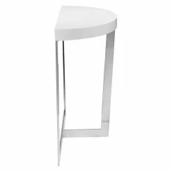 A modern twist on the classic demilune table, the Pangea Home Pearl Console Table is a sleek way to finish off the look of an entryway or hallway. The half-oval top is constructed out of high quality wood veneers and comes in your choice of available finishes. Supporting the top is a highly polished steel base that consists of two perpendicular, rectangular legs.