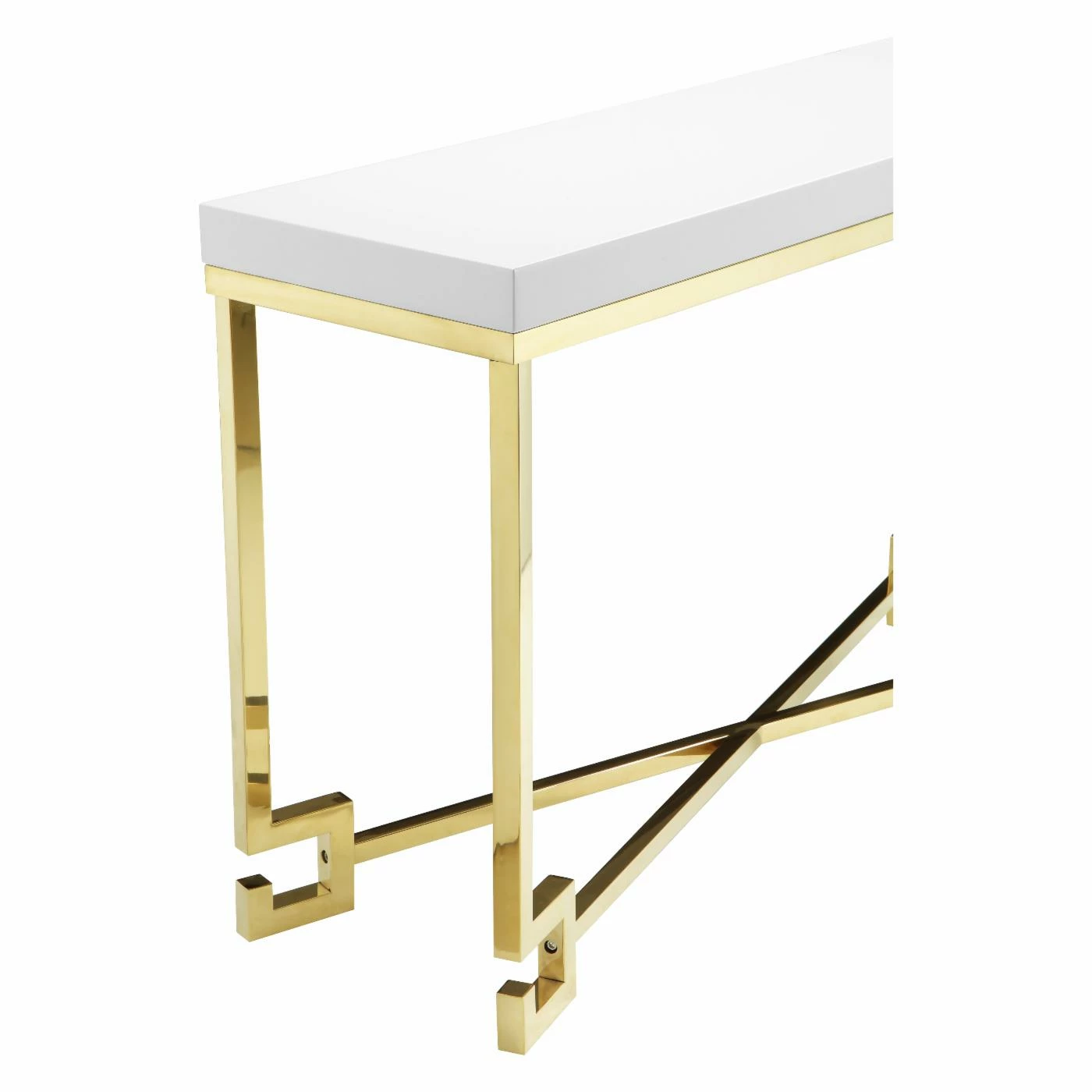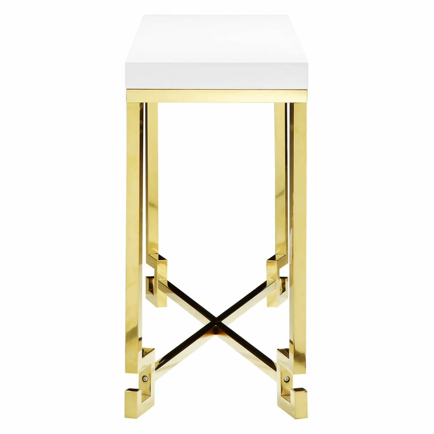 Classic and contemporary design elements come together in the Pangea Home Sophia Console, making it a triumphant celebration of transitional design that will quickly become the centerpiece of any space. The high gloss, white lacquer top and polished gold legs combine to create a beautiful aesthetic that will elevate your entryway or foyer like never before.
