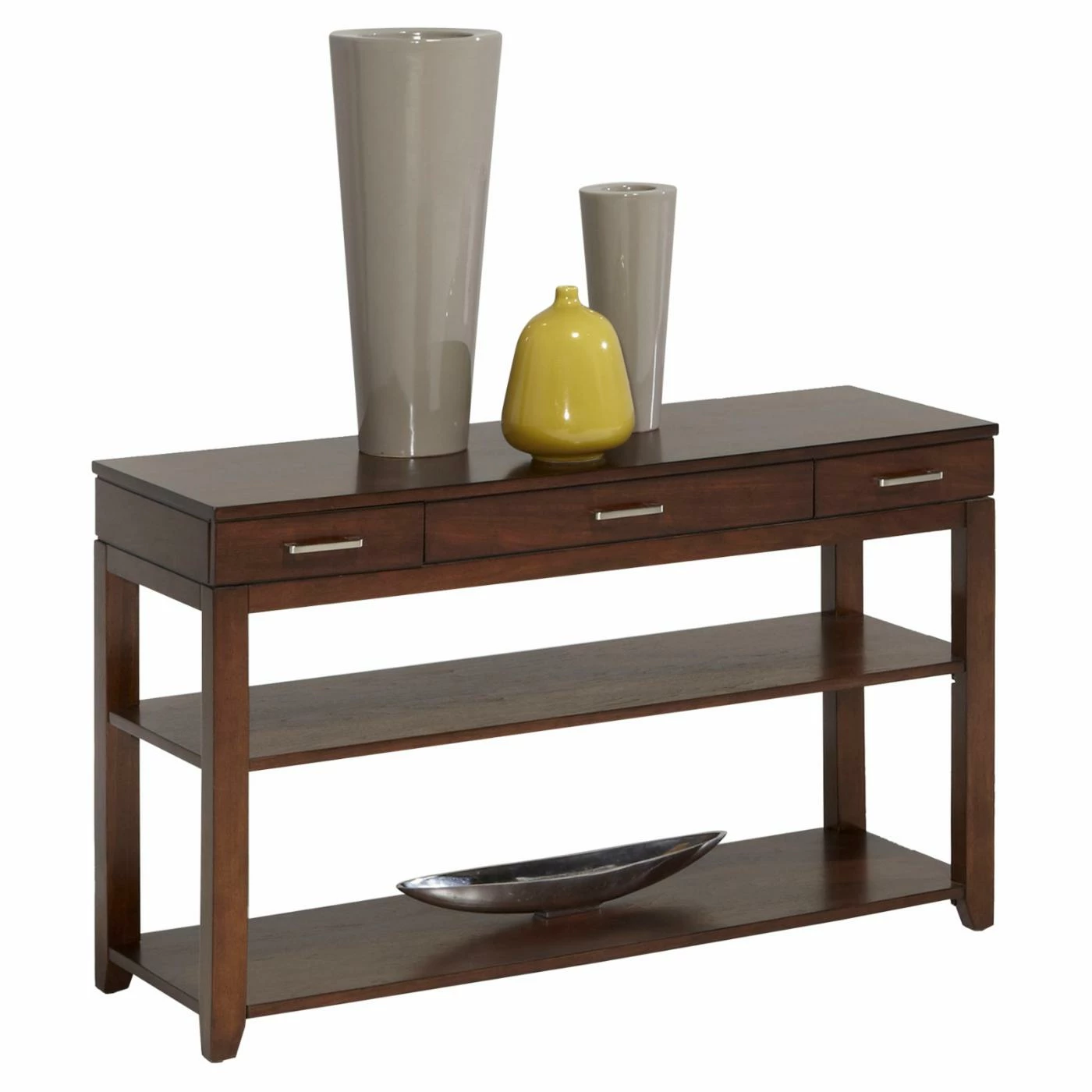 The artfully crafted Progressive Furniture Daytona Console Table in regal brown will look fabulous at the back of your sofa or against the wall in your living room or foyer. Attractive and functional, this poplar solids and walnut veneer table offers a three drawer, mid-shelf storage, and a full lower shelf.