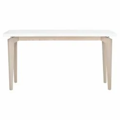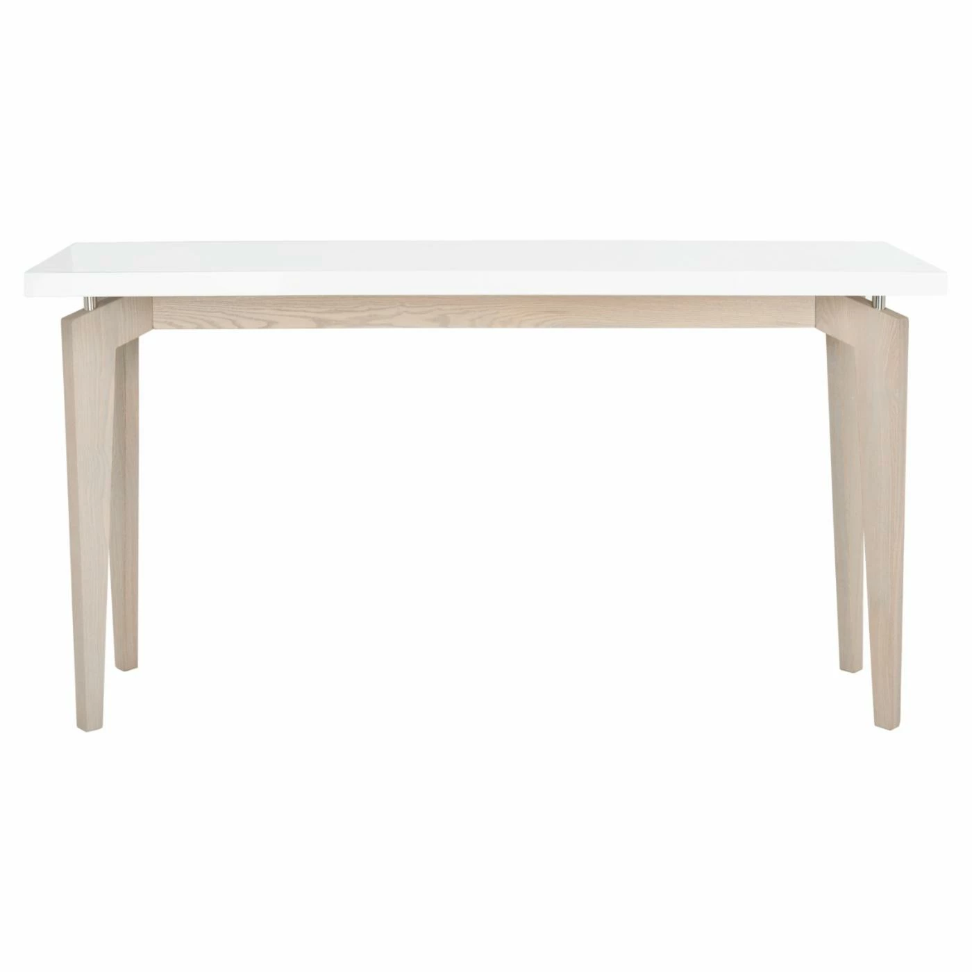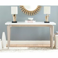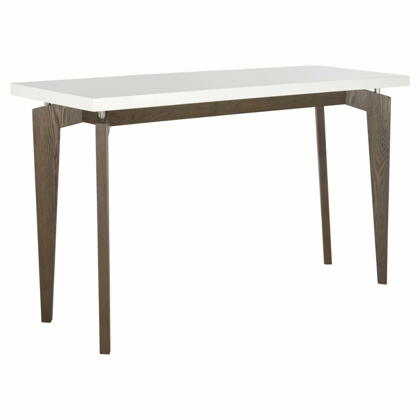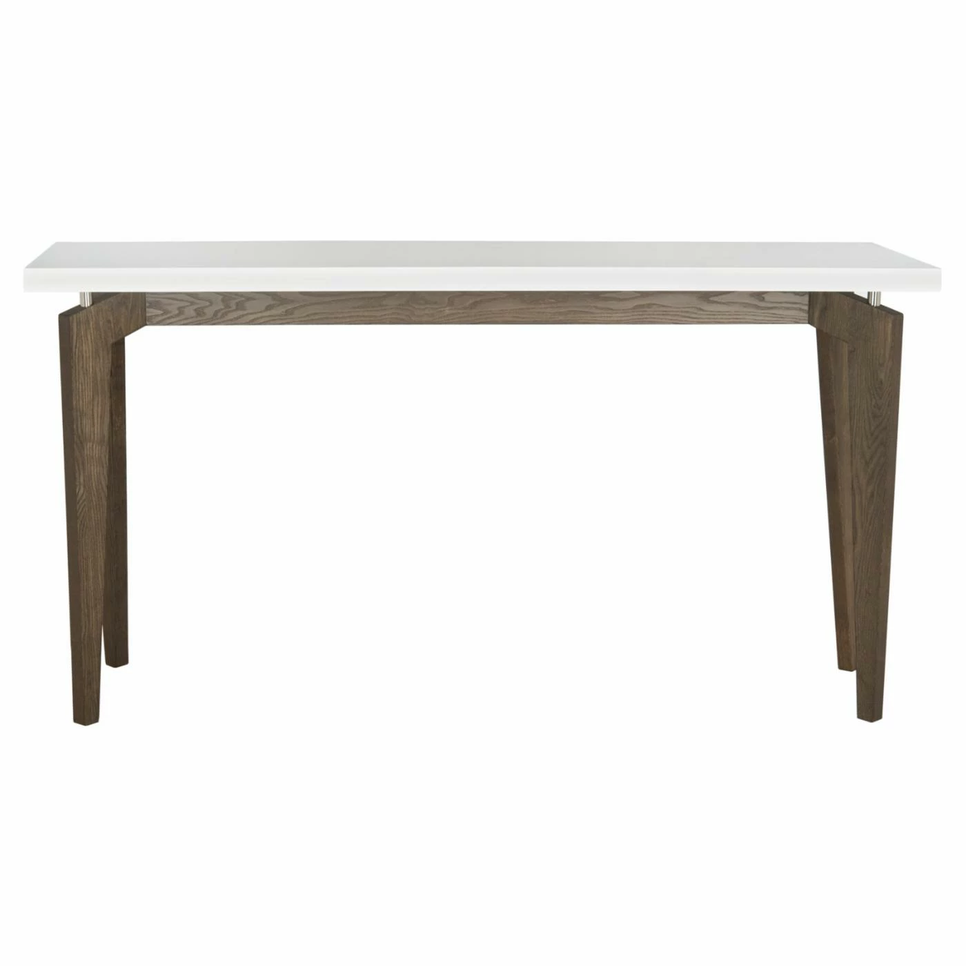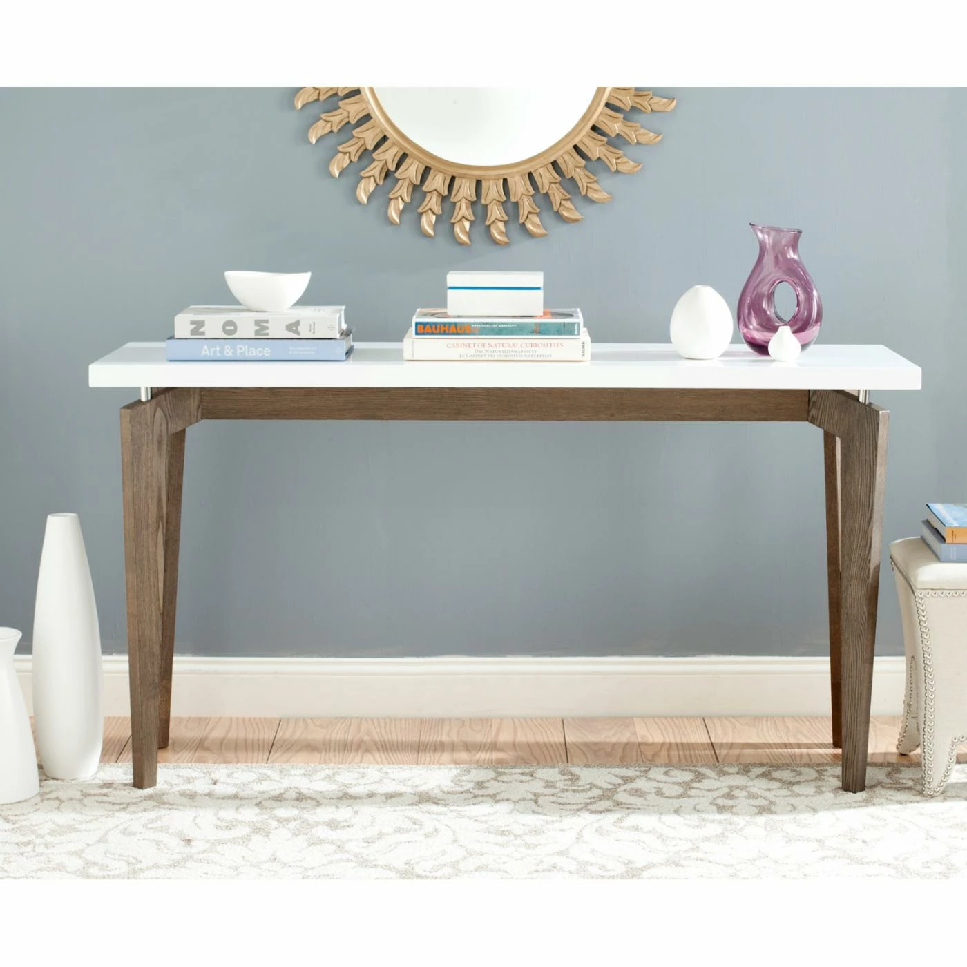A simple slab top seems to hover weightlessly in the design of the Safavieh Josef Lacquer Floating Top Console Table. Stainless steel posts make this dramatic floating effect possible and provide sturdy support for the solid engineered wood top. Simple tapered, engineered wood legs in a contrasting finish add interest to the design without detracting from the floating tabletop.