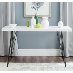 Add some mid-century flair to your entryway or seating area with the Safavieh Wolcott Lacquer Console Table. Iron hairpin legs reflect the dramatic diagonals of the vintage originals and are finished in black for a bold look. An engineered wood top in a contrasting finish completes the design.