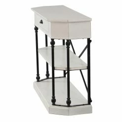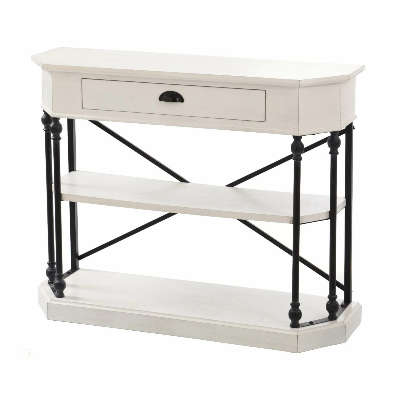A compact design abundant in storage and display, the StyleCraft 3 Tier Single Drawer Clipped Corner Console Table is perfect for your entryway. This console table is constructed of wood in an antique white finish. Each shelf is supported by a metal frame. An X-style support at the back and turned supports on the sides are finished in black for contrast. Two open shelves add display, and one drawer offers enclosed storage. Clipped corners give this console table a unique shape and a smaller footprint.